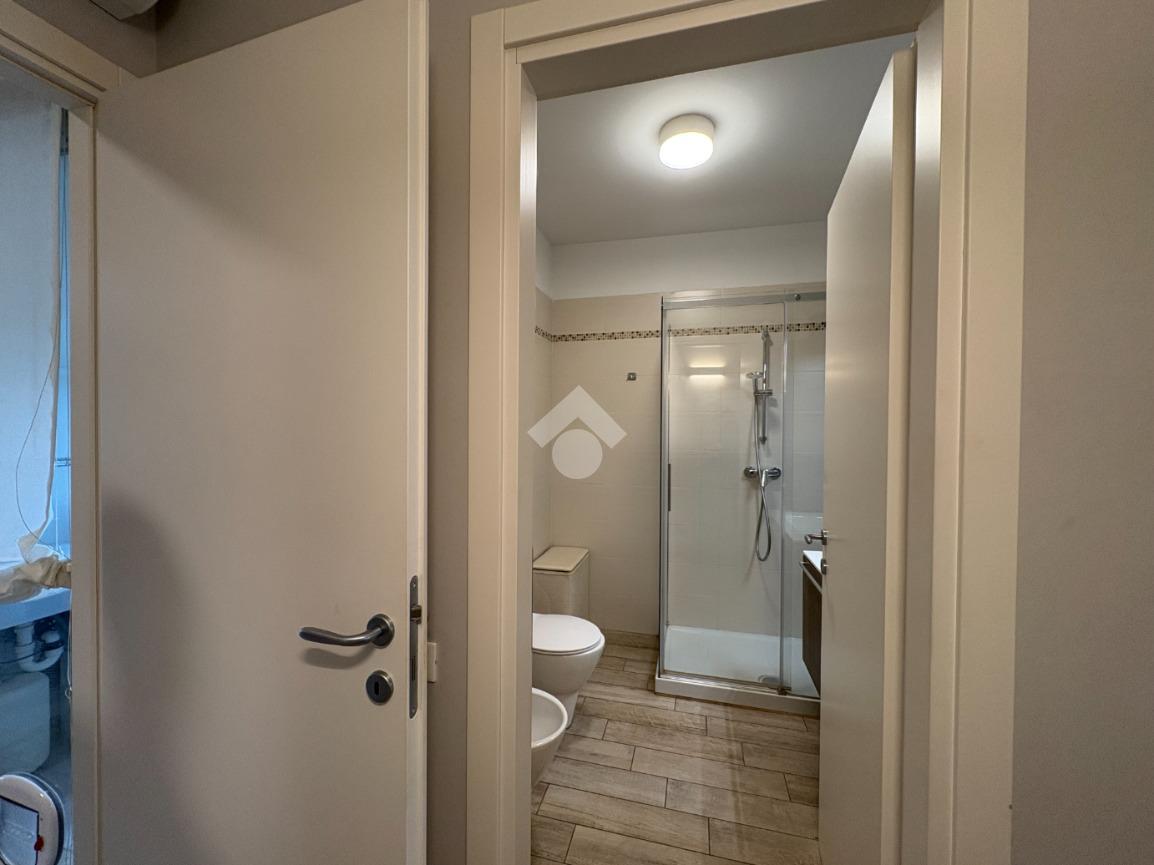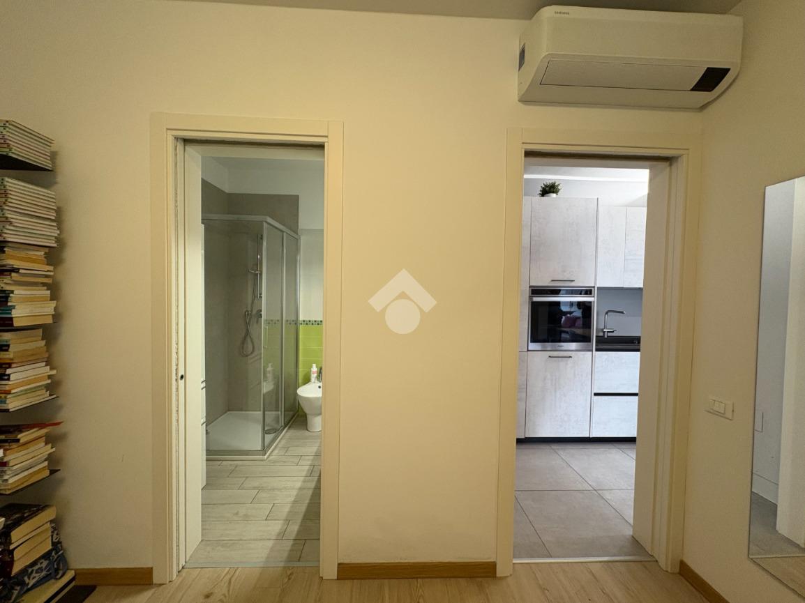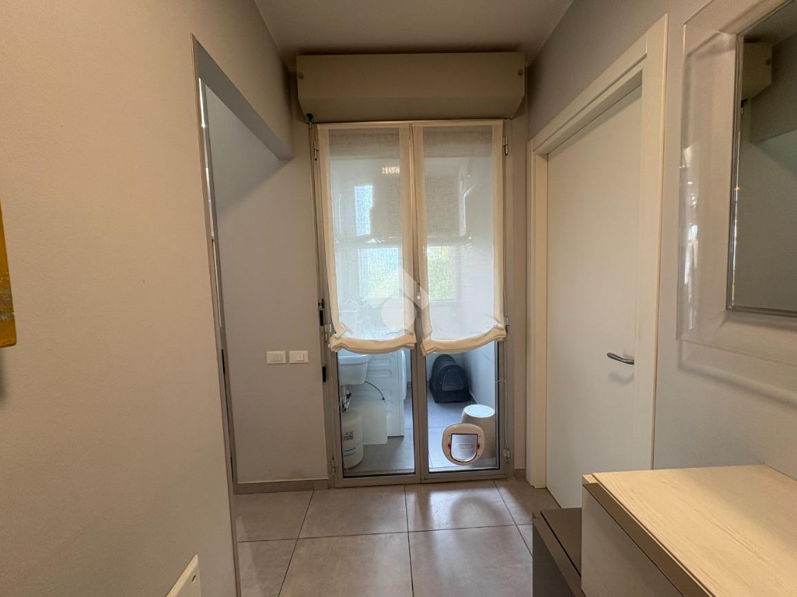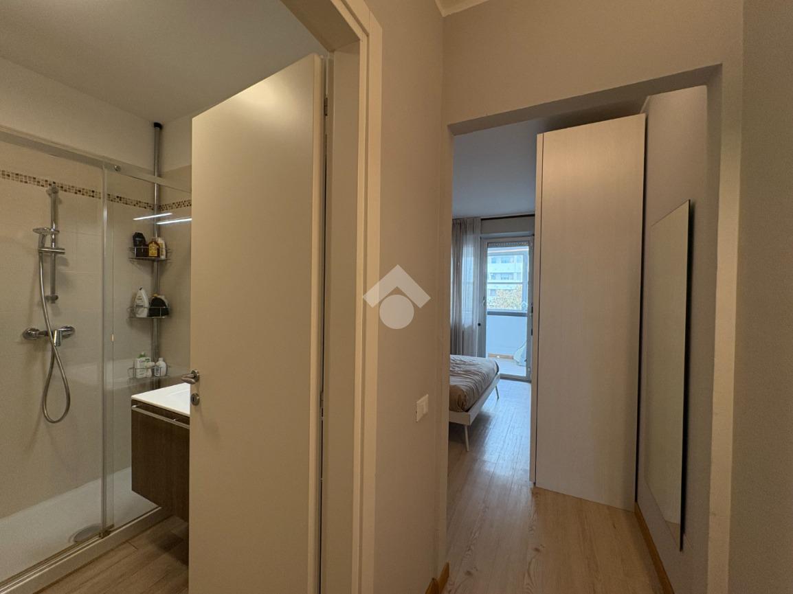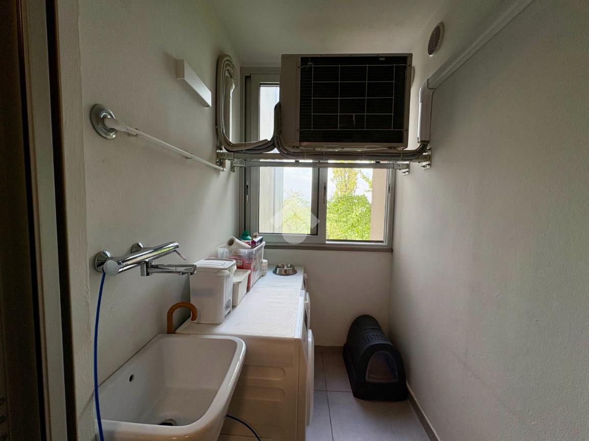 Appena varcata la soglia, troviamo un pratico vano lavanderia di fronte all'ingresso. Sulla destra, una porta conduce alla prima, accogliente camera matrimoniale, con accesso a un comodo balcone loggiato, e al primo bagno, cieco e dotato di funzionale box doccia.