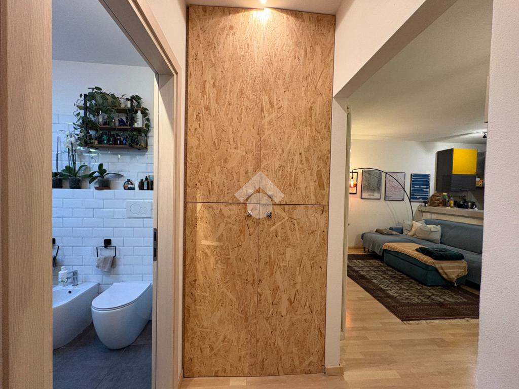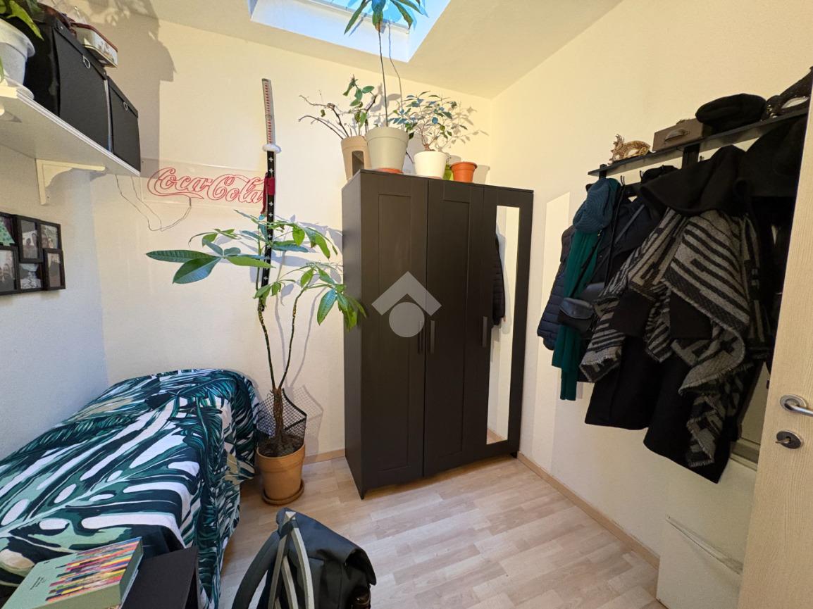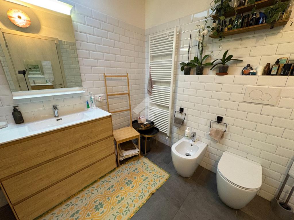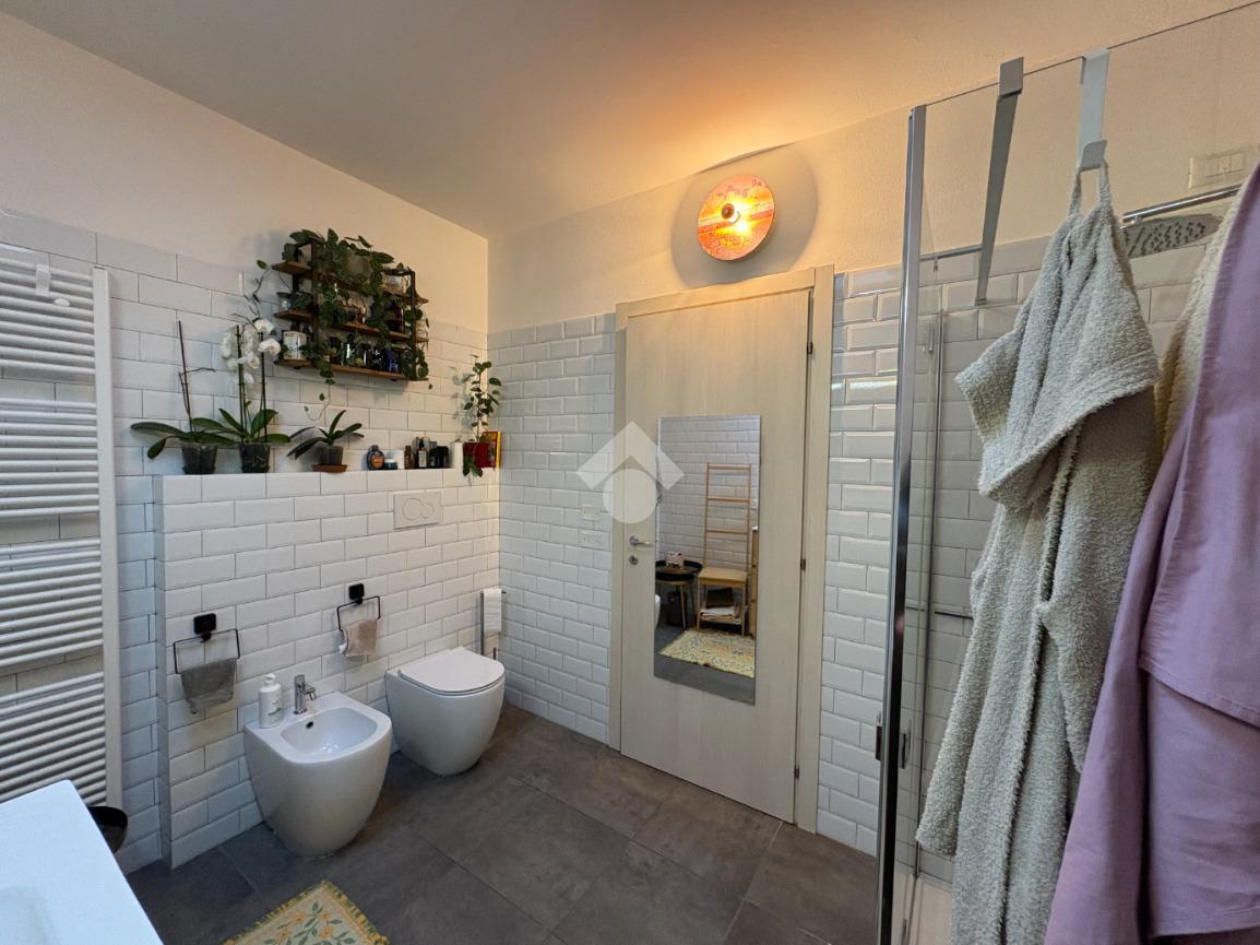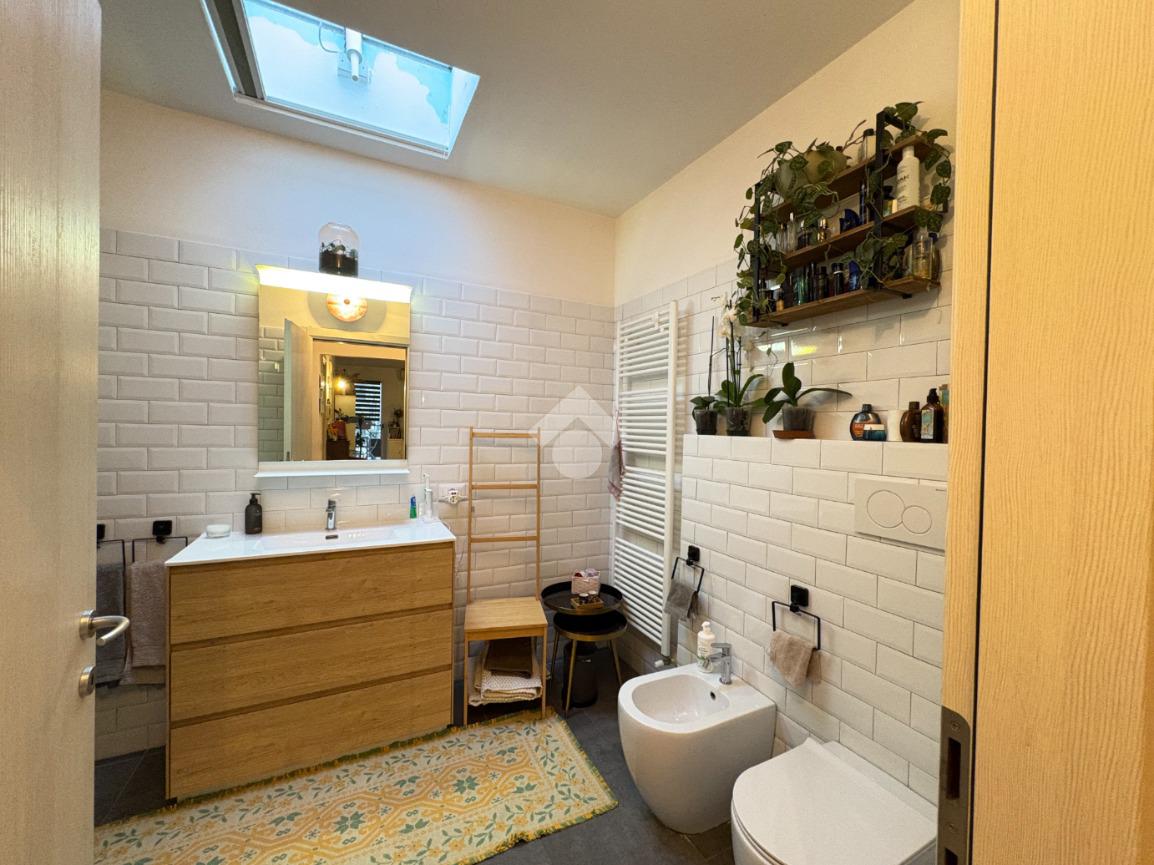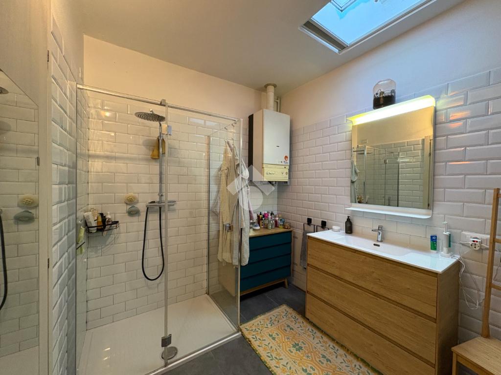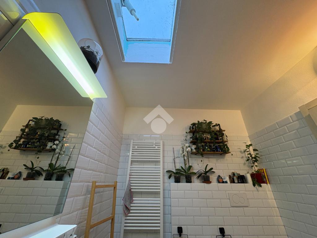 Appena varcata la soglia, a sinistra ti accoglie un disimpegno dove è stato creato un comodo ripostiglio e dove ci condude ad un ampio bagno luminoso grazie al lucernaio, completo di sanitari e box doccia.