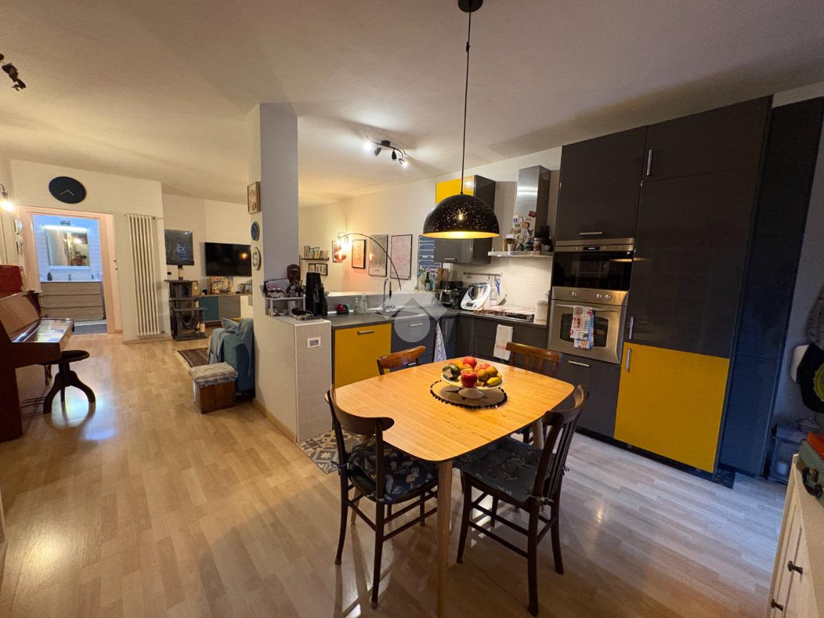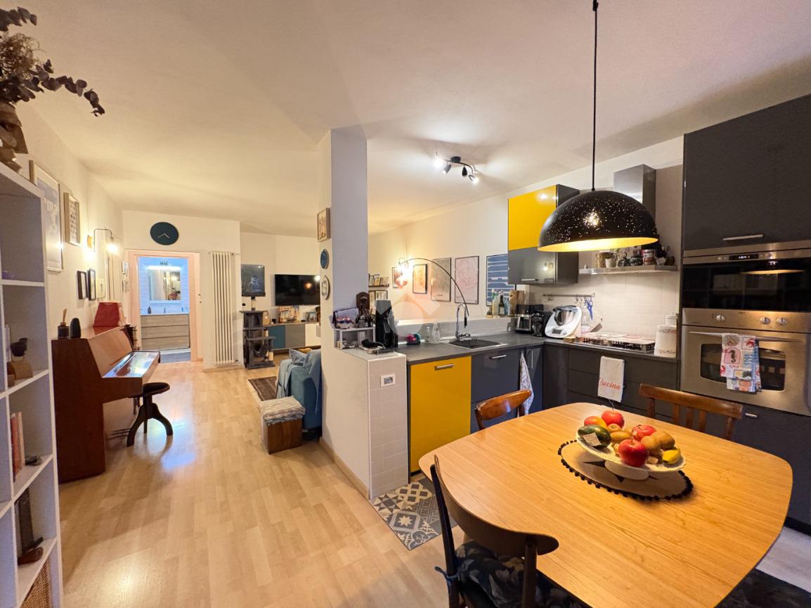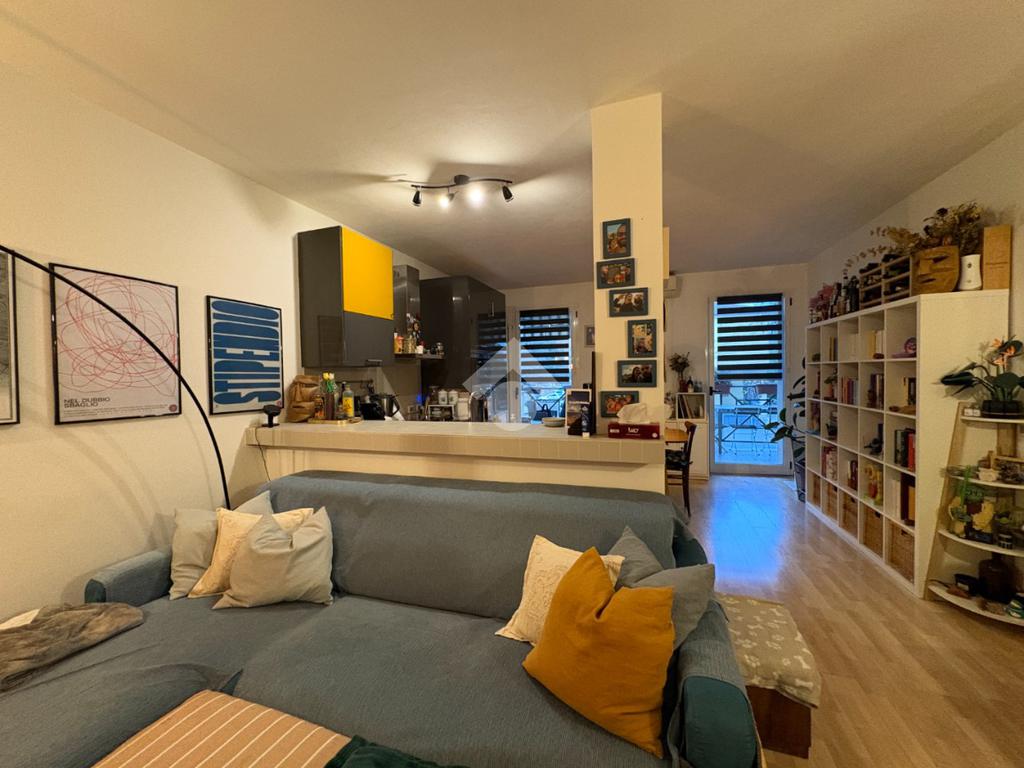 Proseguendo a destra, si entra nel cuore della casa: una spaziosa e luminosa zona giorno dove il soggiorno accogliente è con la cucina funzionale, da cui si accede direttamente a un balcone vivibile, lo spazio esterno perfetto per godersi momenti all'aperto.