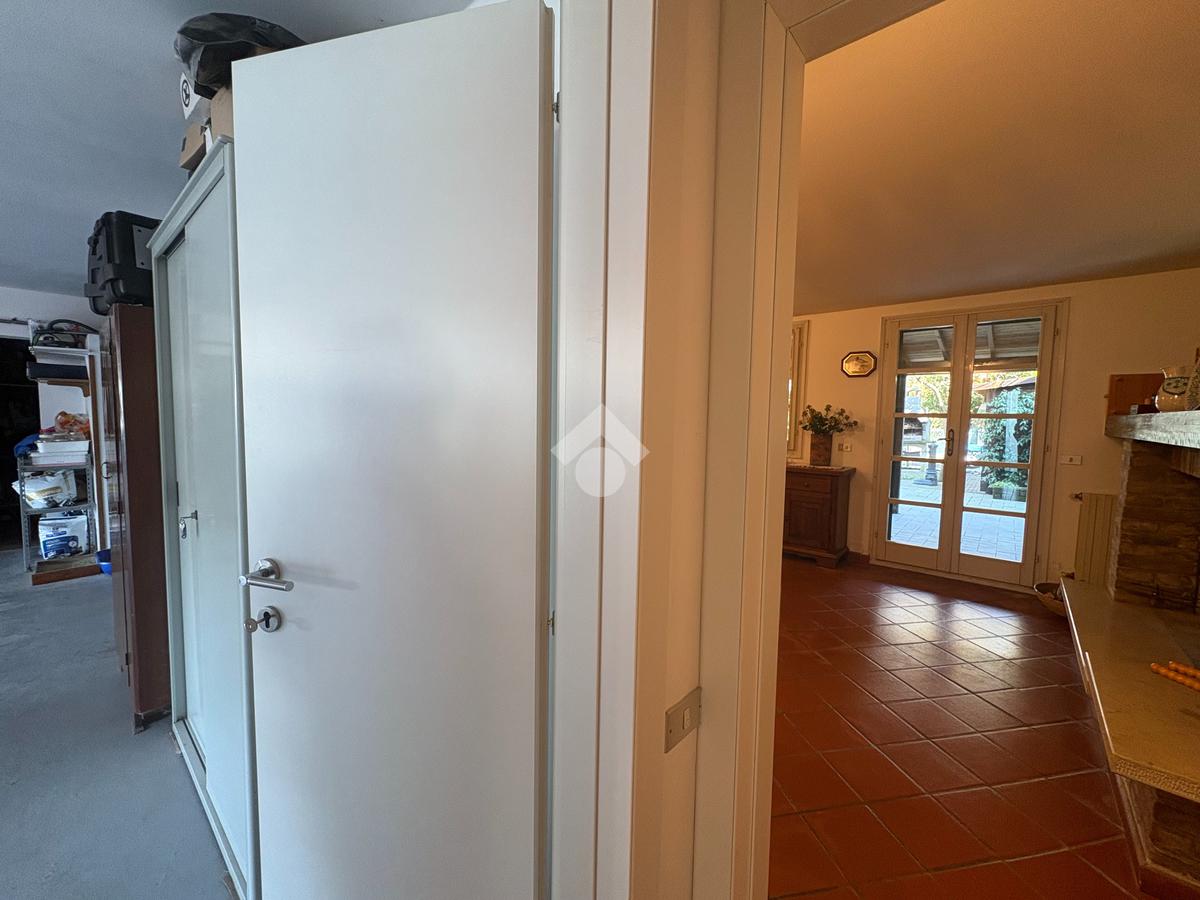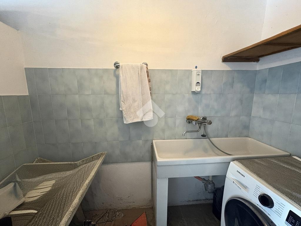 Dal medesimo corridoio si accede al garage, che comprende un doppio vano cantina, un bagno e una zona lavanderia.