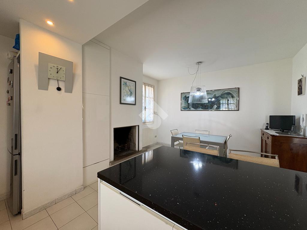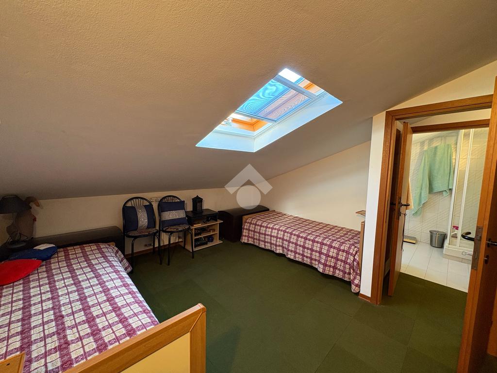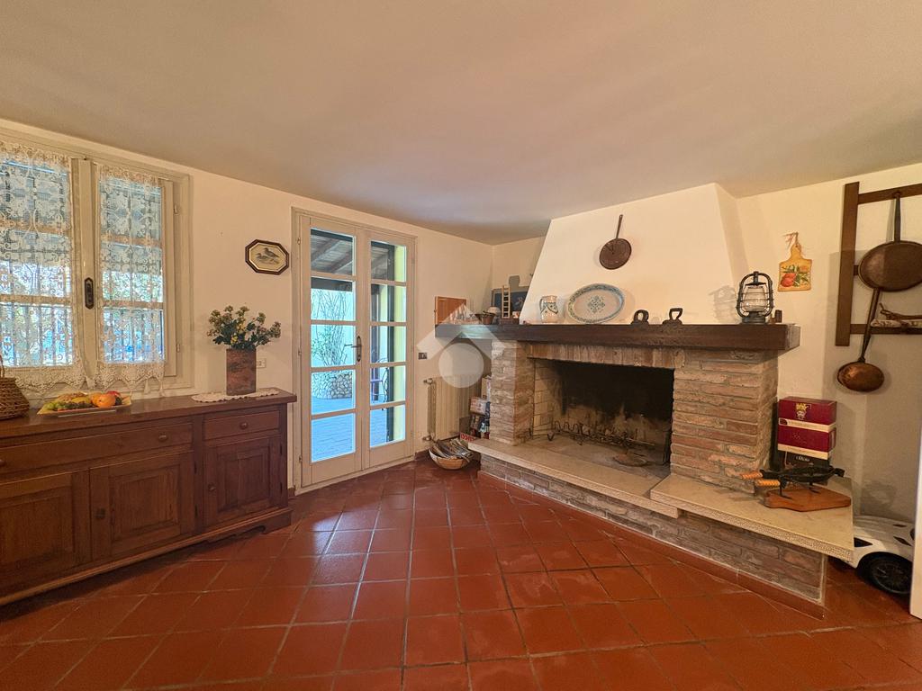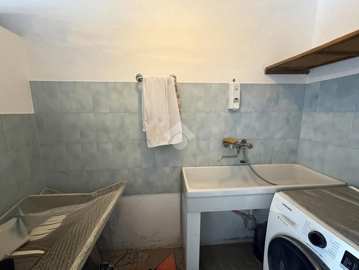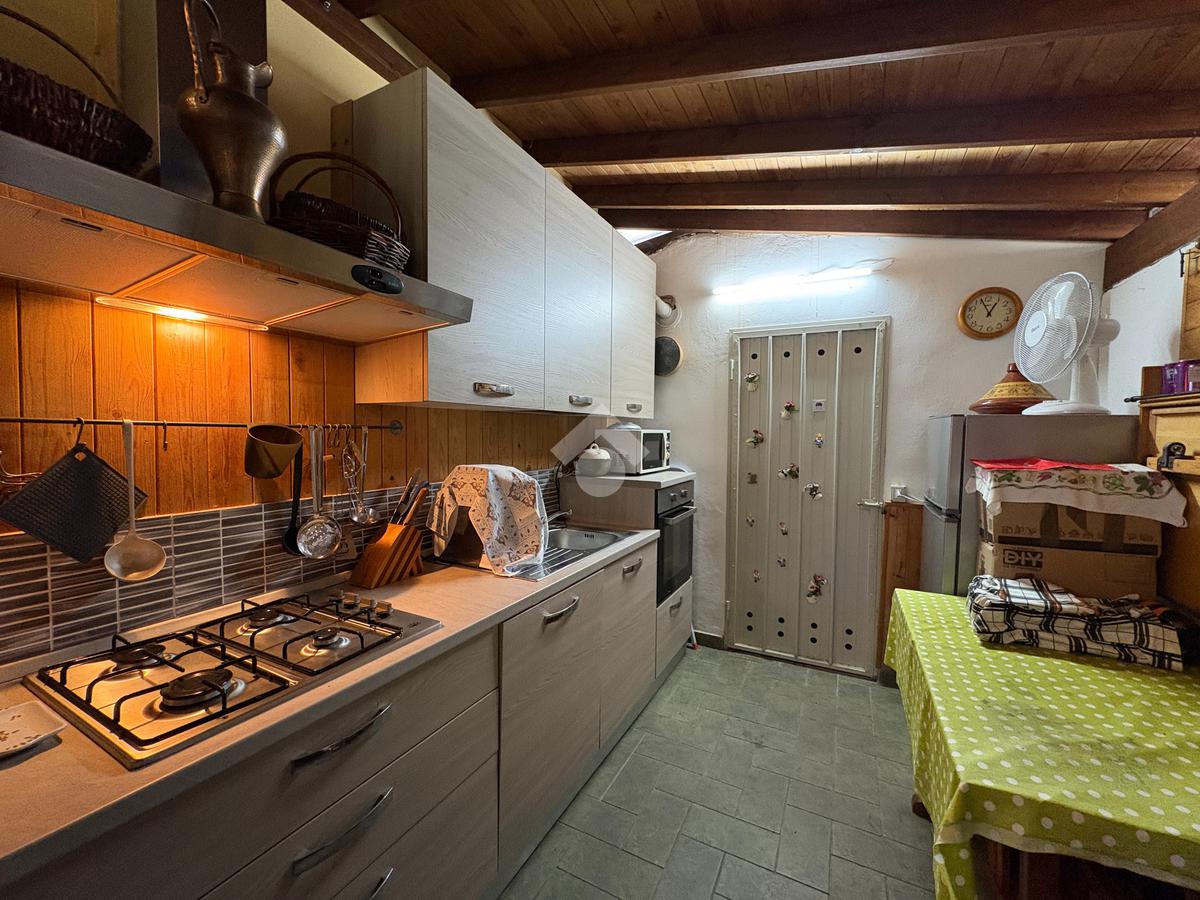 Qui il soggiorno, reso particolarmente accogliente dalla stufa a pellet e dall’accesso diretto al balcone, è separato dalla cucina abitabile dove è presente un secondo camino a legna funzionante.