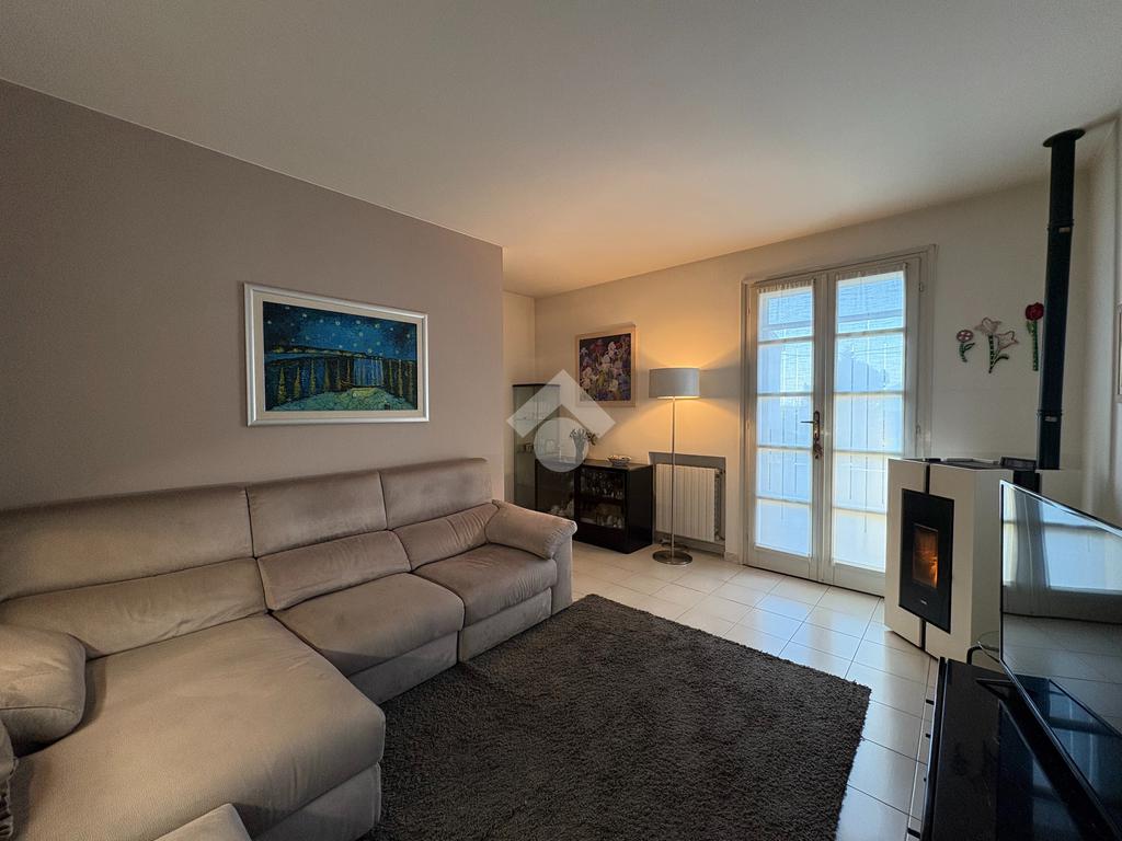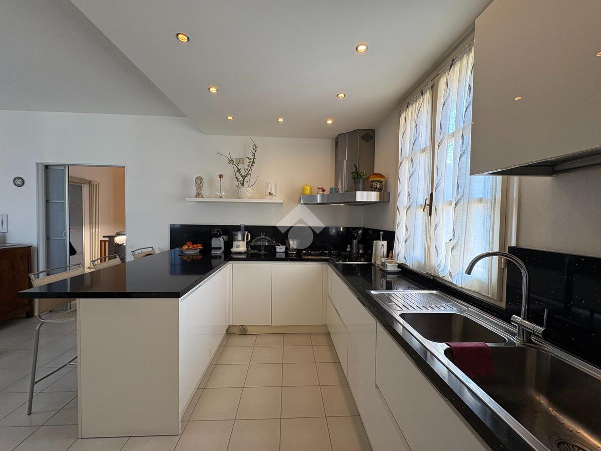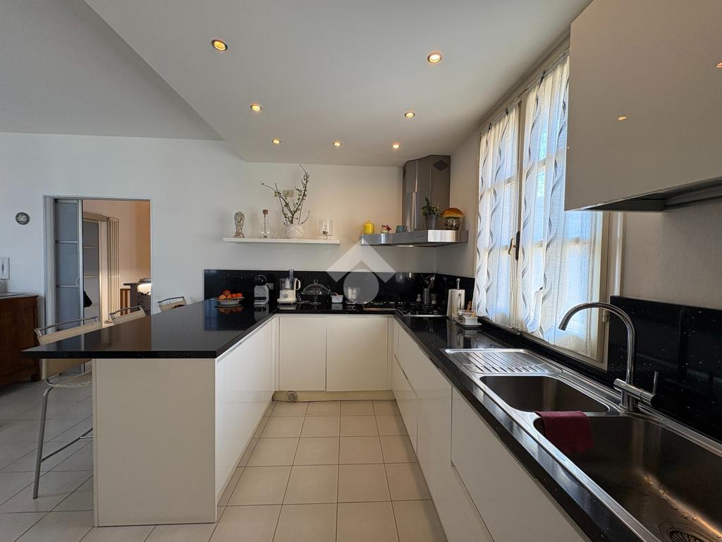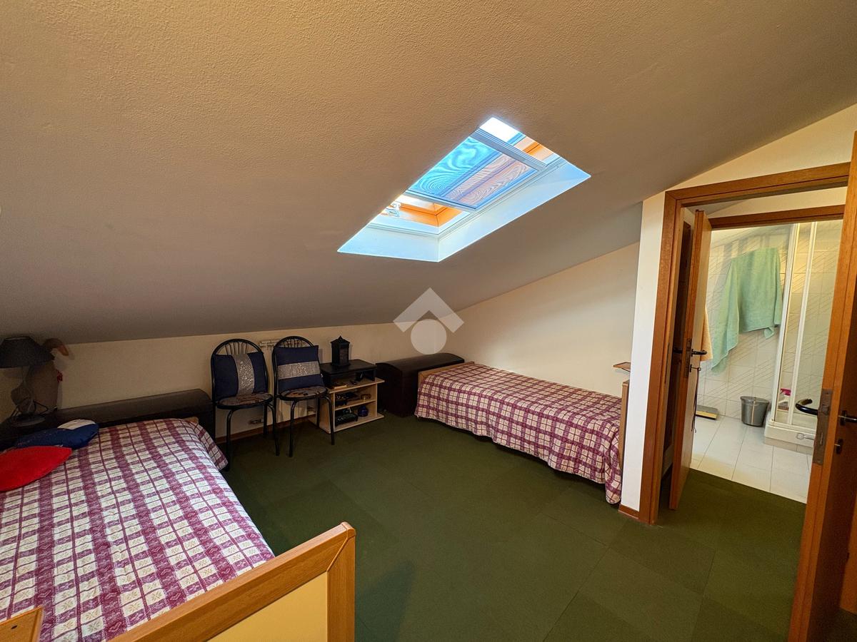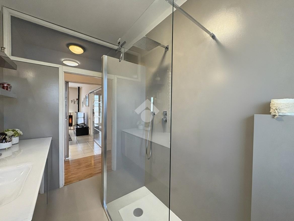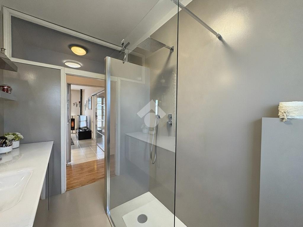 Qui il soggiorno, reso particolarmente accogliente dalla stufa a pellet e dall’accesso diretto al balcone, è separato dalla cucina abitabile dove è presente un secondo camino a legna funzionante.