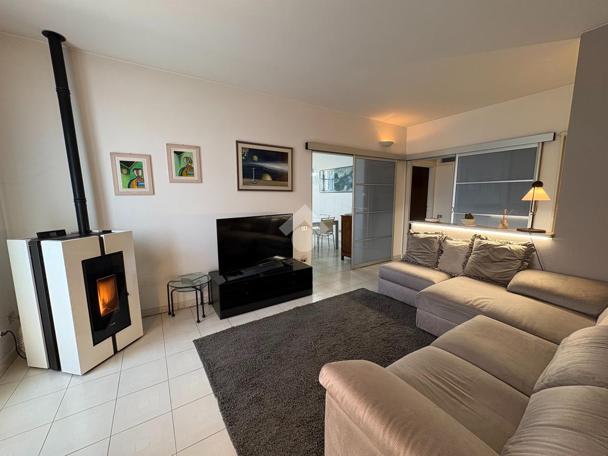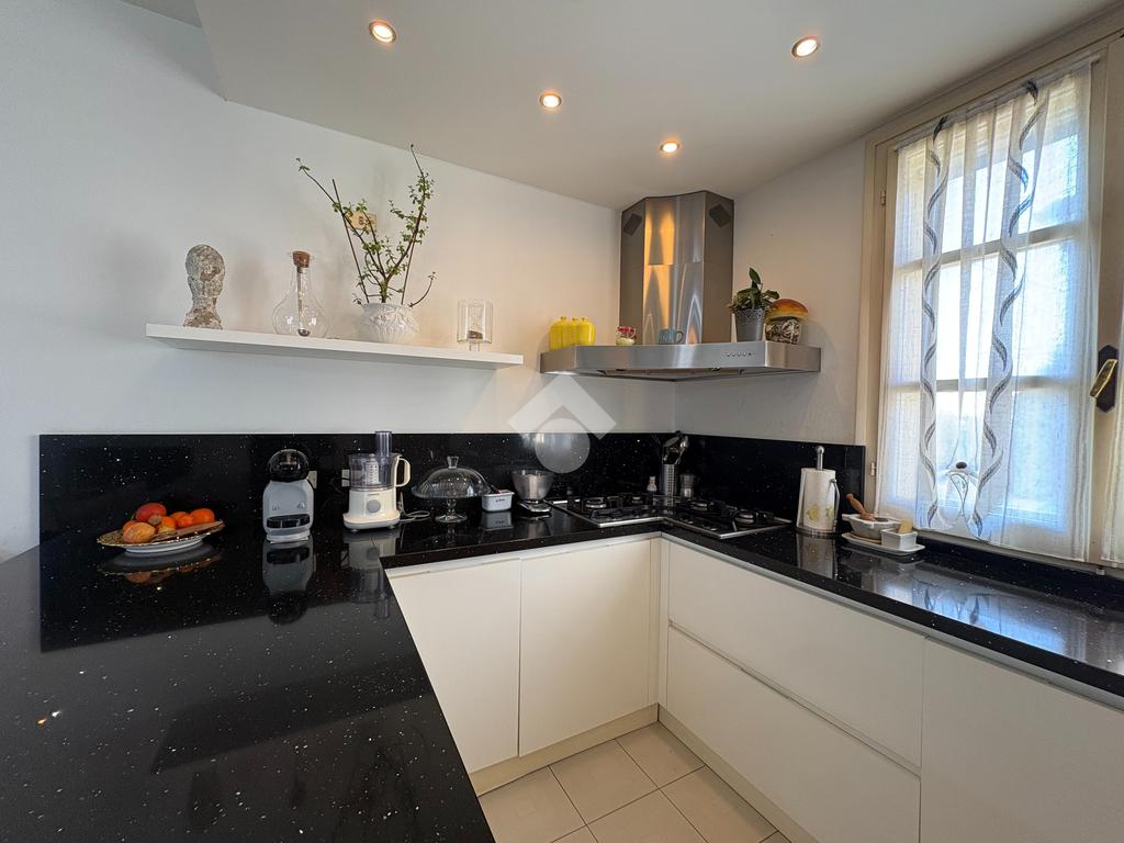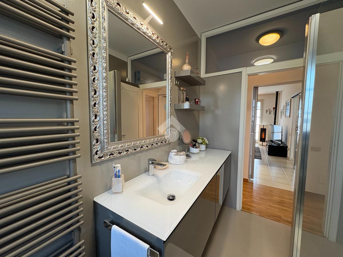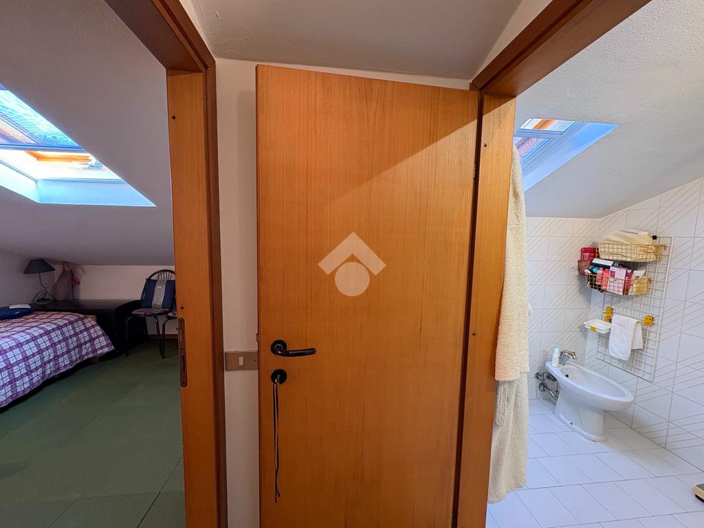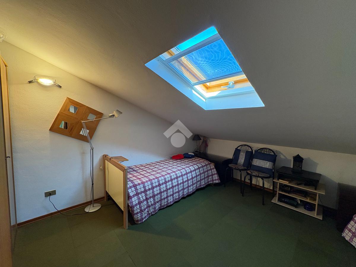 Qui il soggiorno, reso particolarmente accogliente dalla stufa a pellet e dall’accesso diretto al balcone, è separato dalla cucina abitabile dove è presente un secondo camino a legna funzionante.