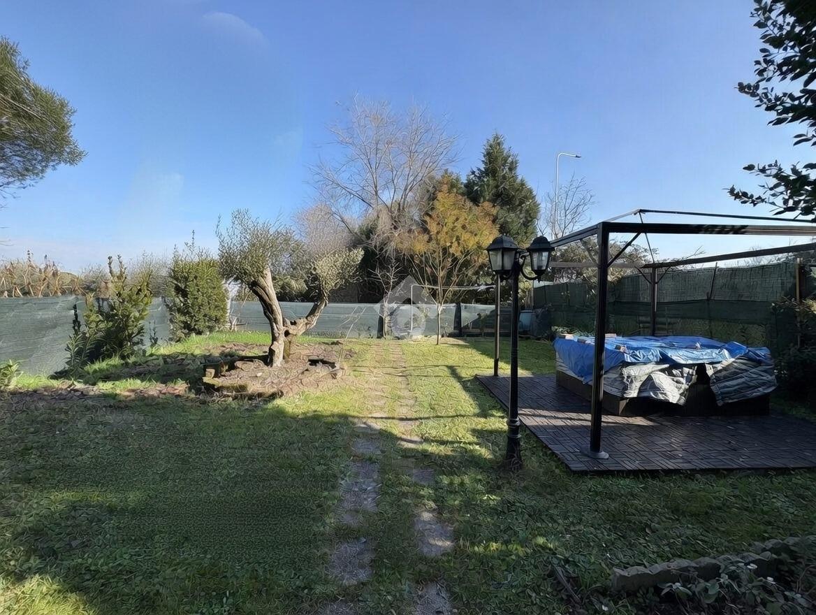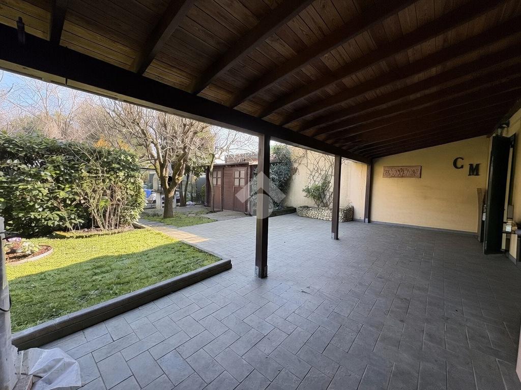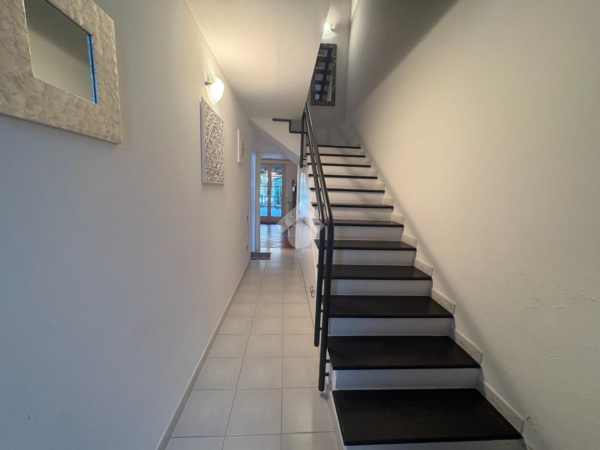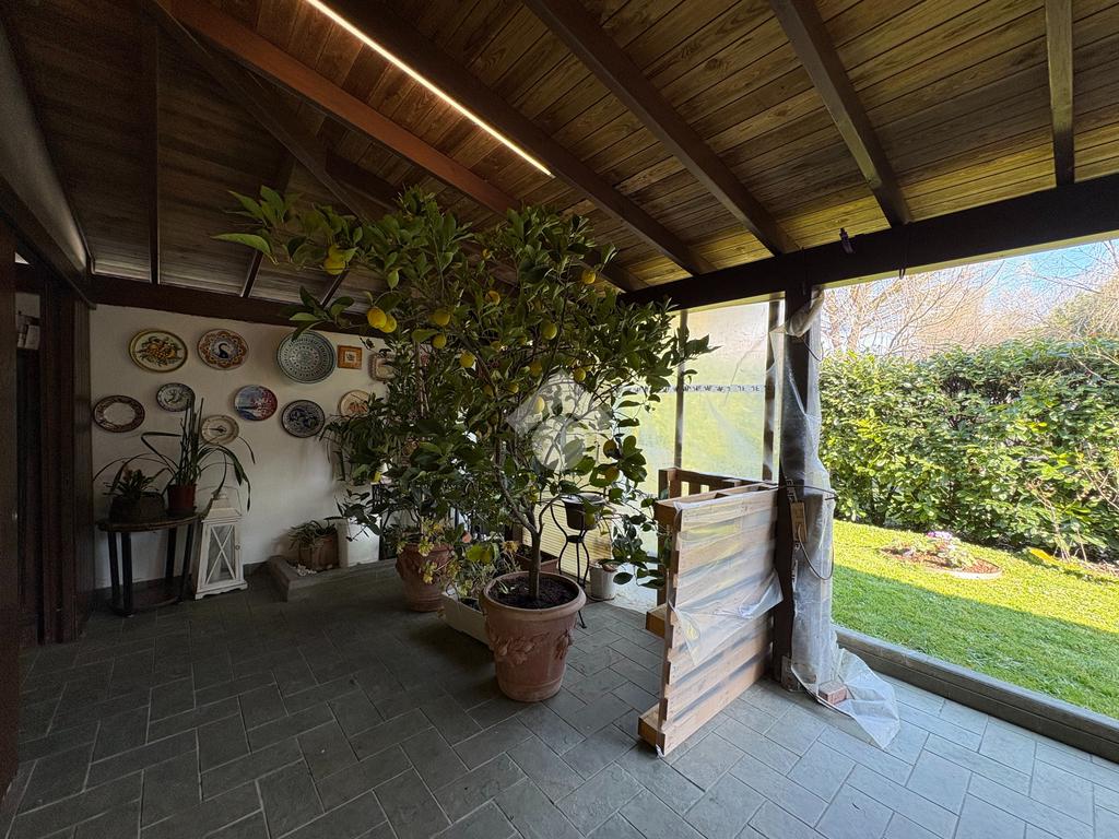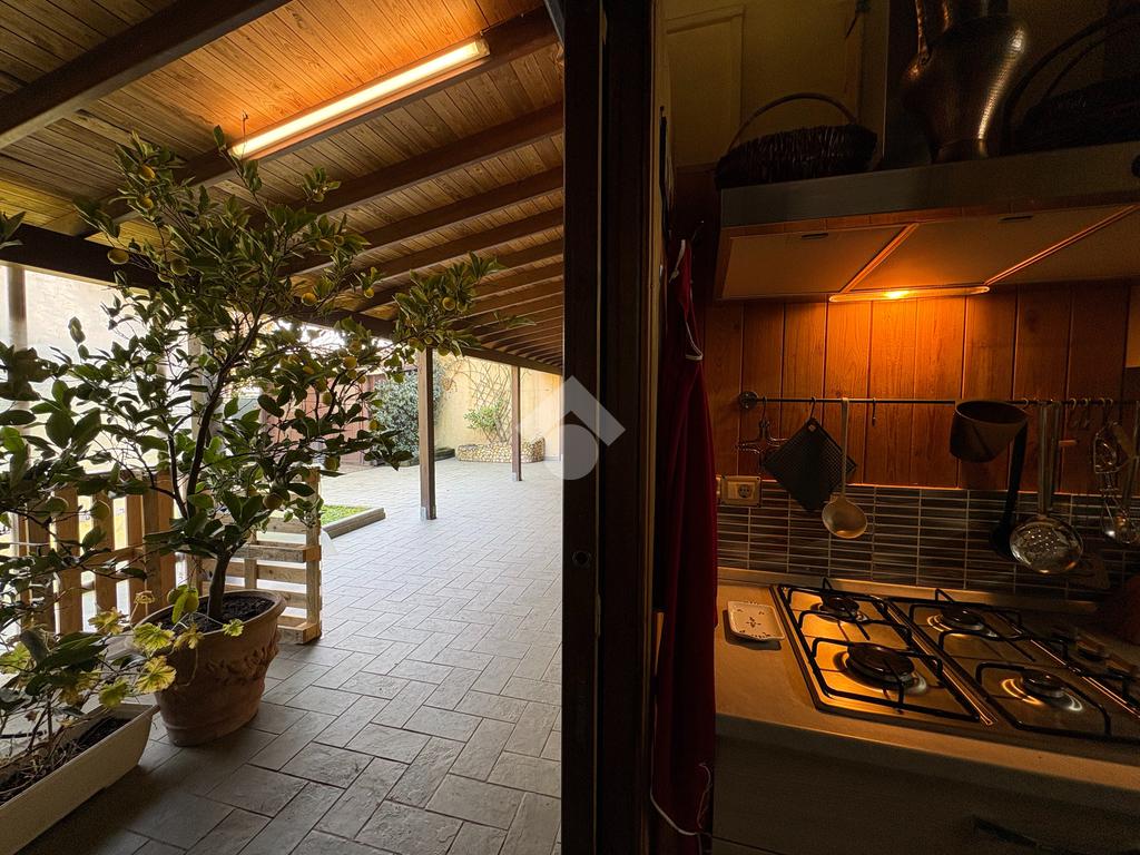 Dalla taverna si raggiunge l’ampia zona esterna dotata di portico e cucina esterna, perfetta per organizzare cene all’aperto senza dover salire e scendere dalla casa.
