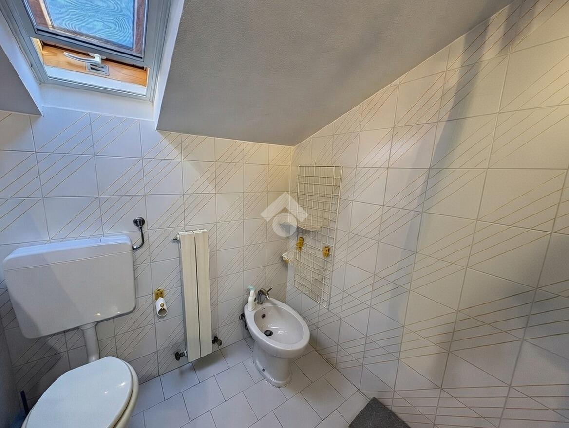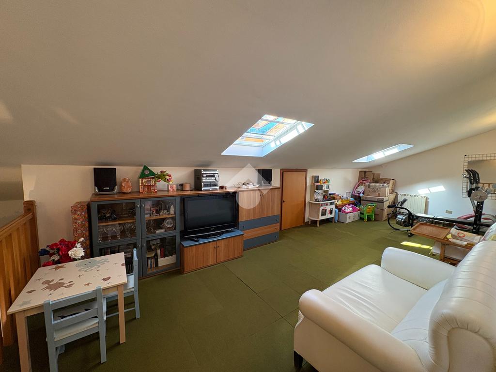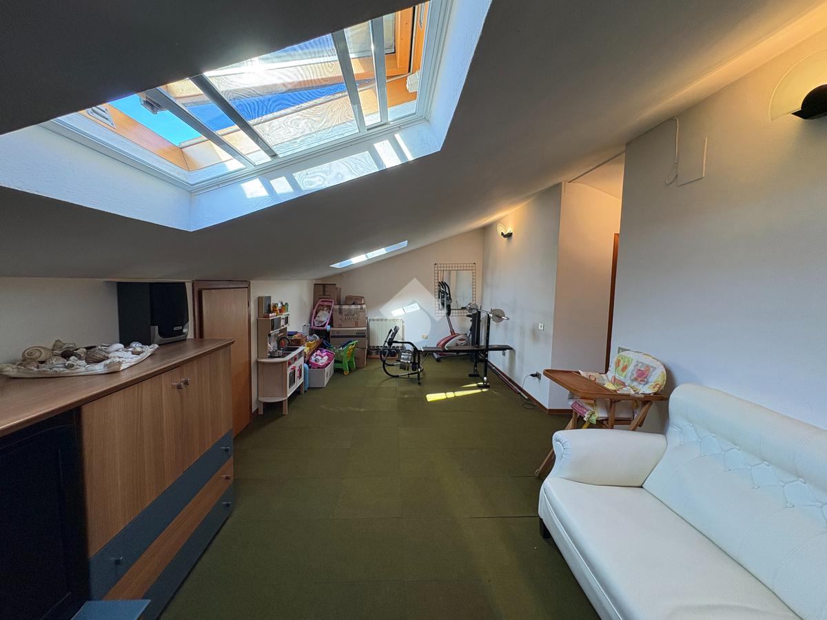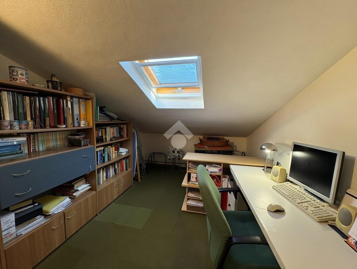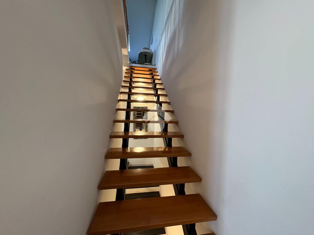 Ritornando in soggiorno, dietro la zona divano si trova un’ulteriore scala che sale alla mansarda, dove oggi troviamo uno studio, la stanza dei giochi, un ulteriore vano adibito a camera da letto e un secondo bagno completo di box doccia, sanitari e lavandino a servizio dell’intero piano.
