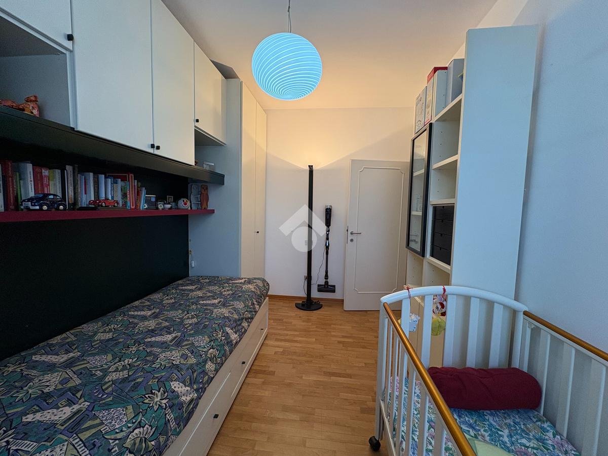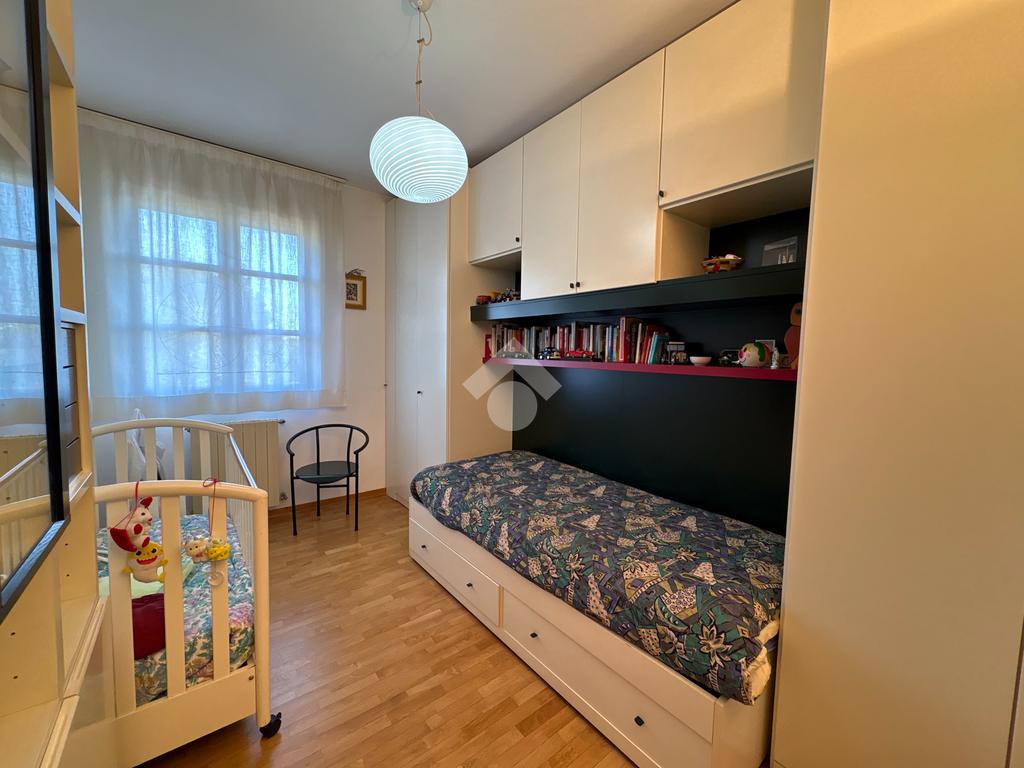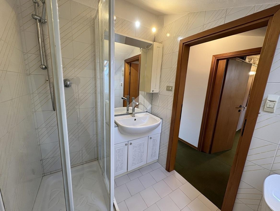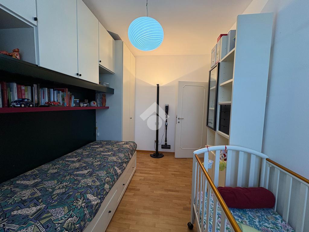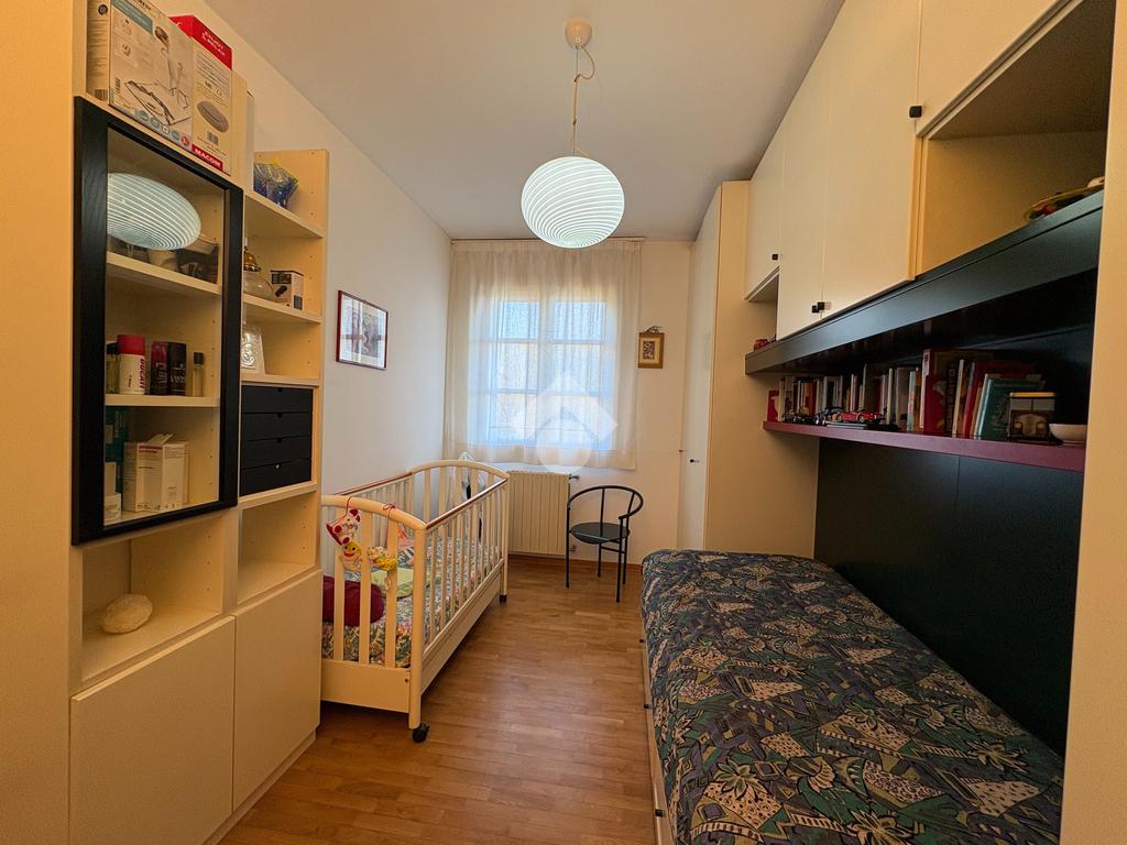 Sulla destra del soggiorno, un piccolo disimpegno distributivo porta alla camera matrimoniale, alla camera singola e al bagno finestrato completo di box doccia.
