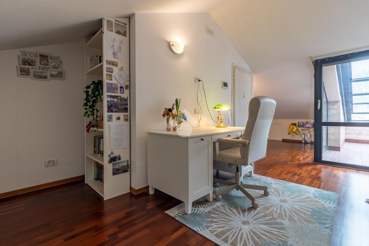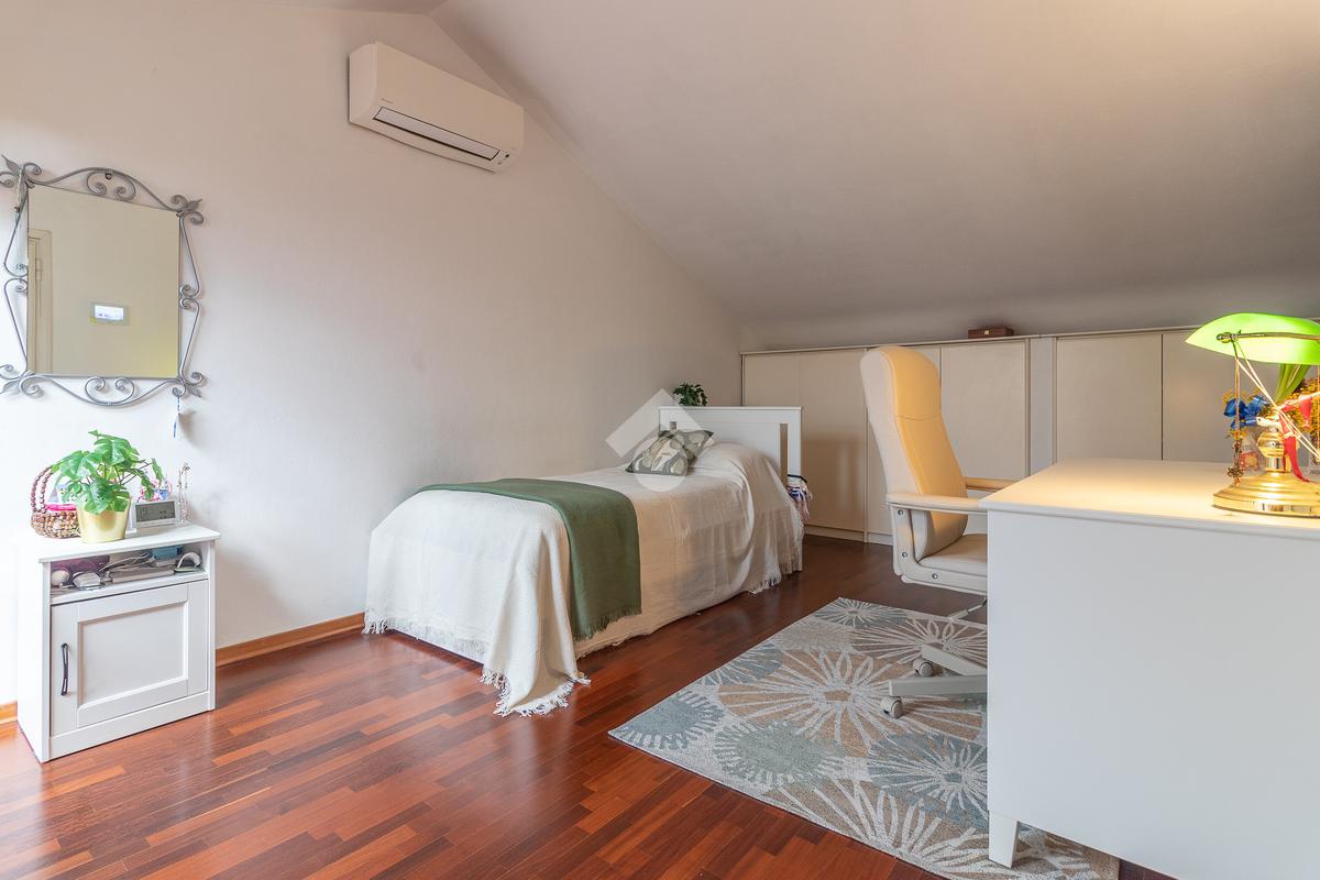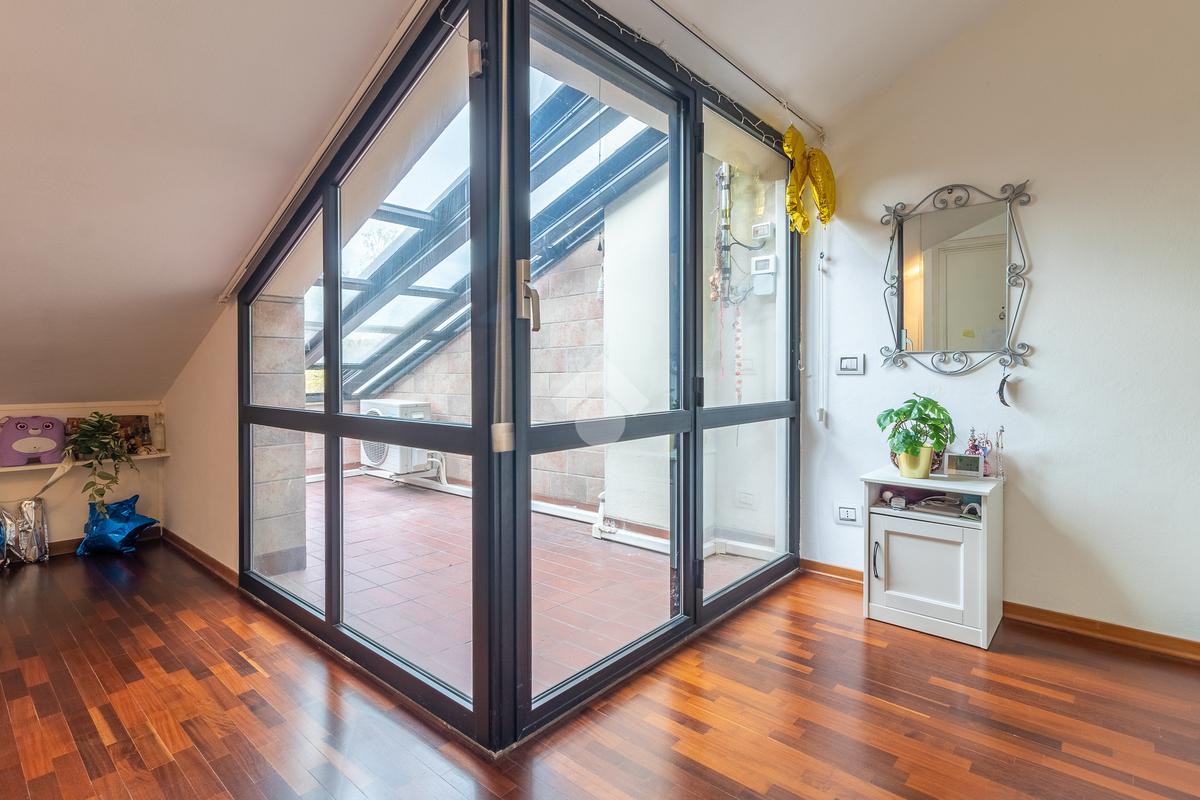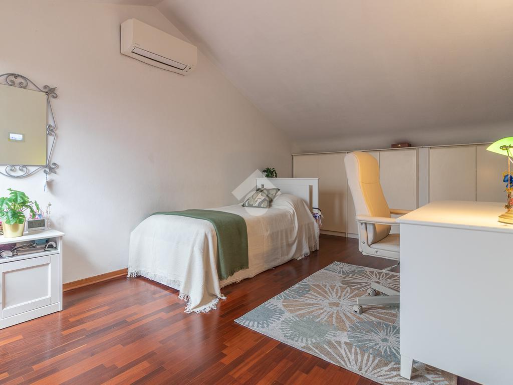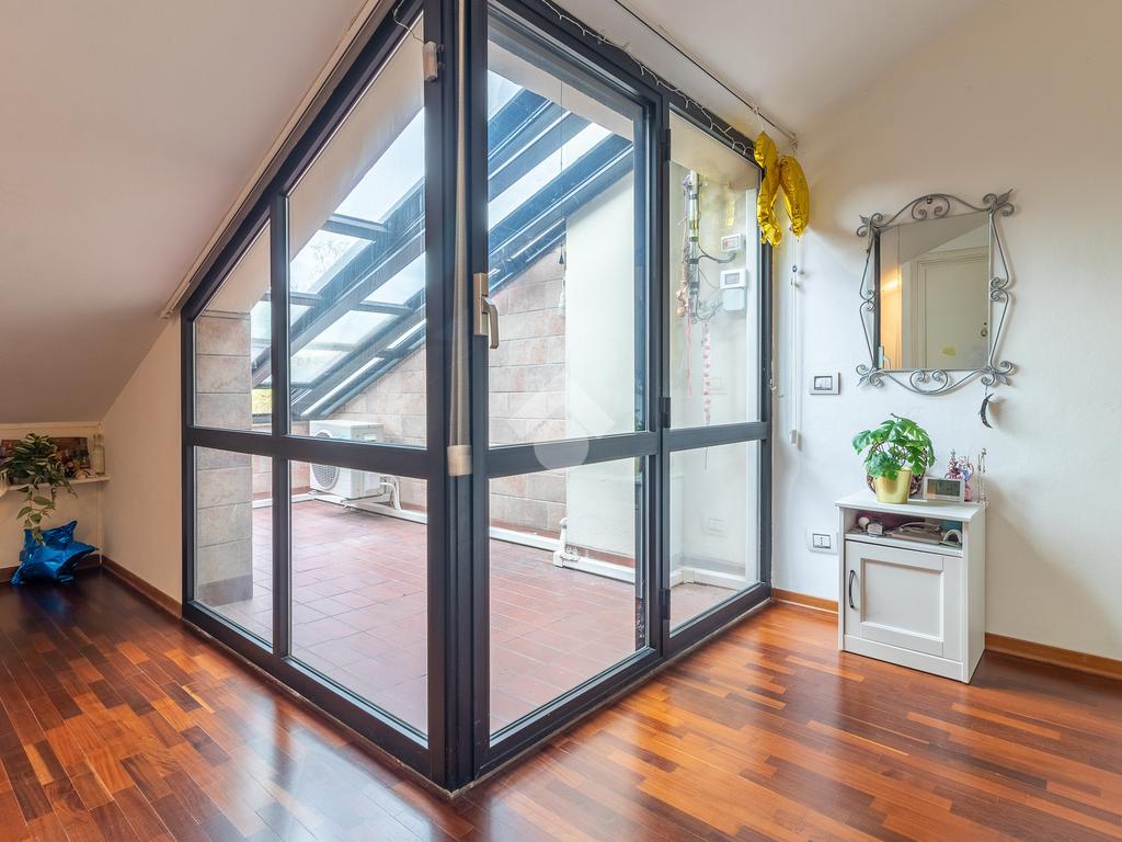 Accediamo all'ultimo livello, la zona mansardata, attualmente utilizzata come terza camera da letto, dotata di un comodo solarium.
