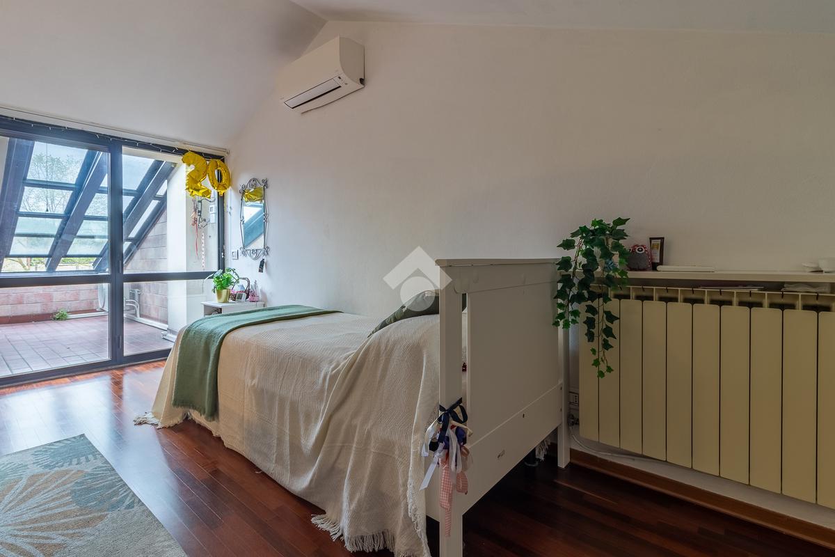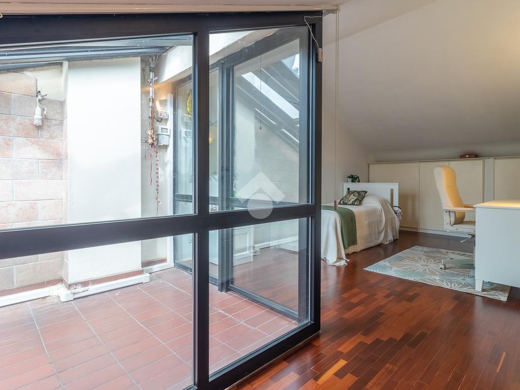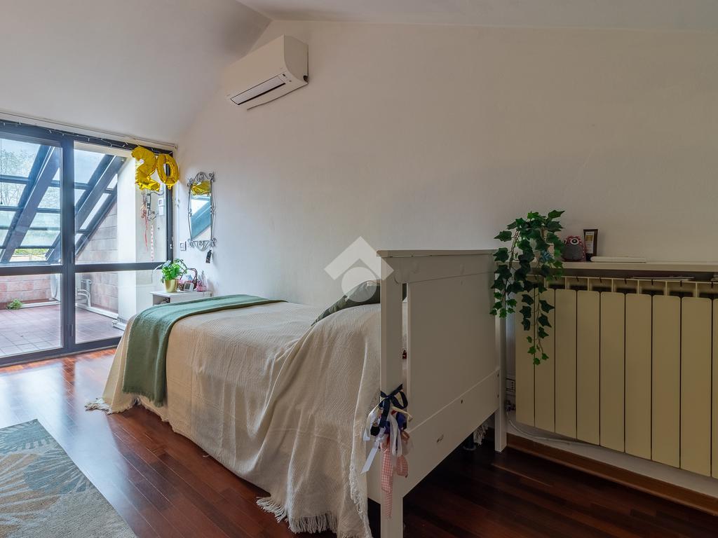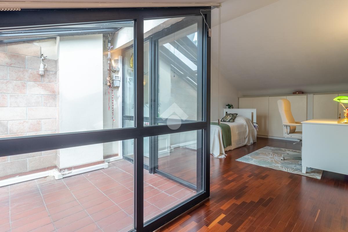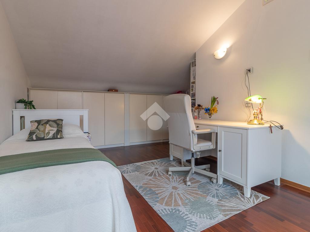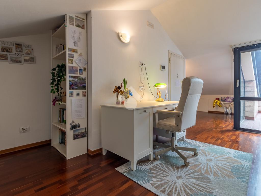 Accediamo all'ultimo livello, la zona mansardata, attualmente utilizzata come terza camera da letto, dotata di un comodo solarium.