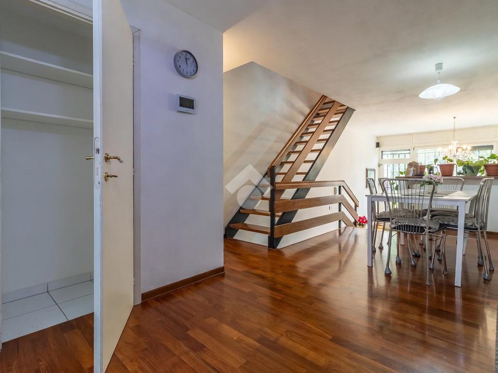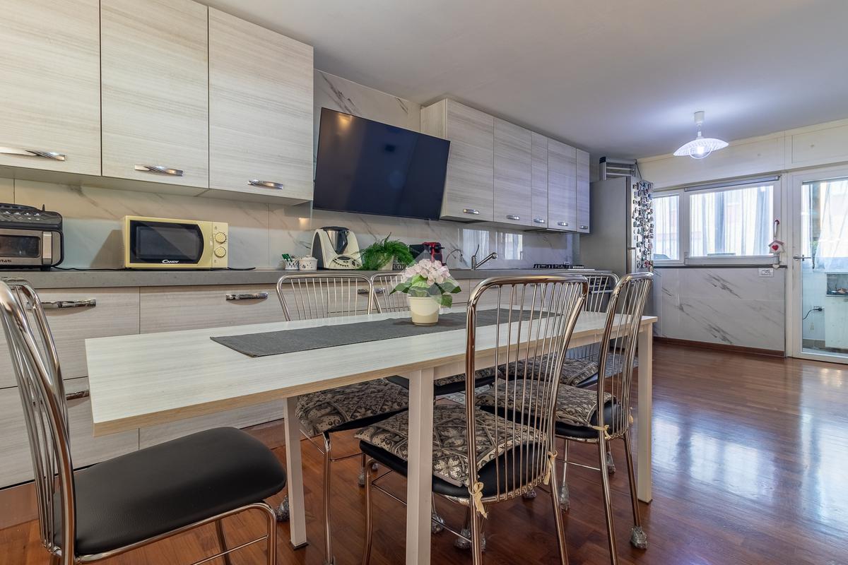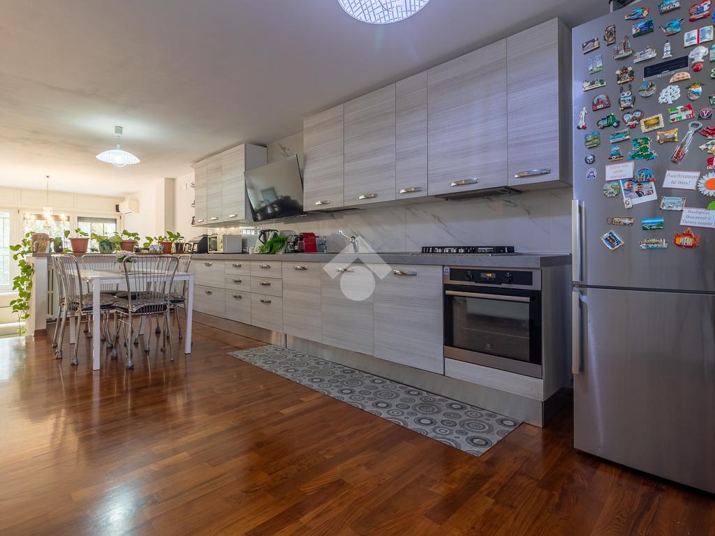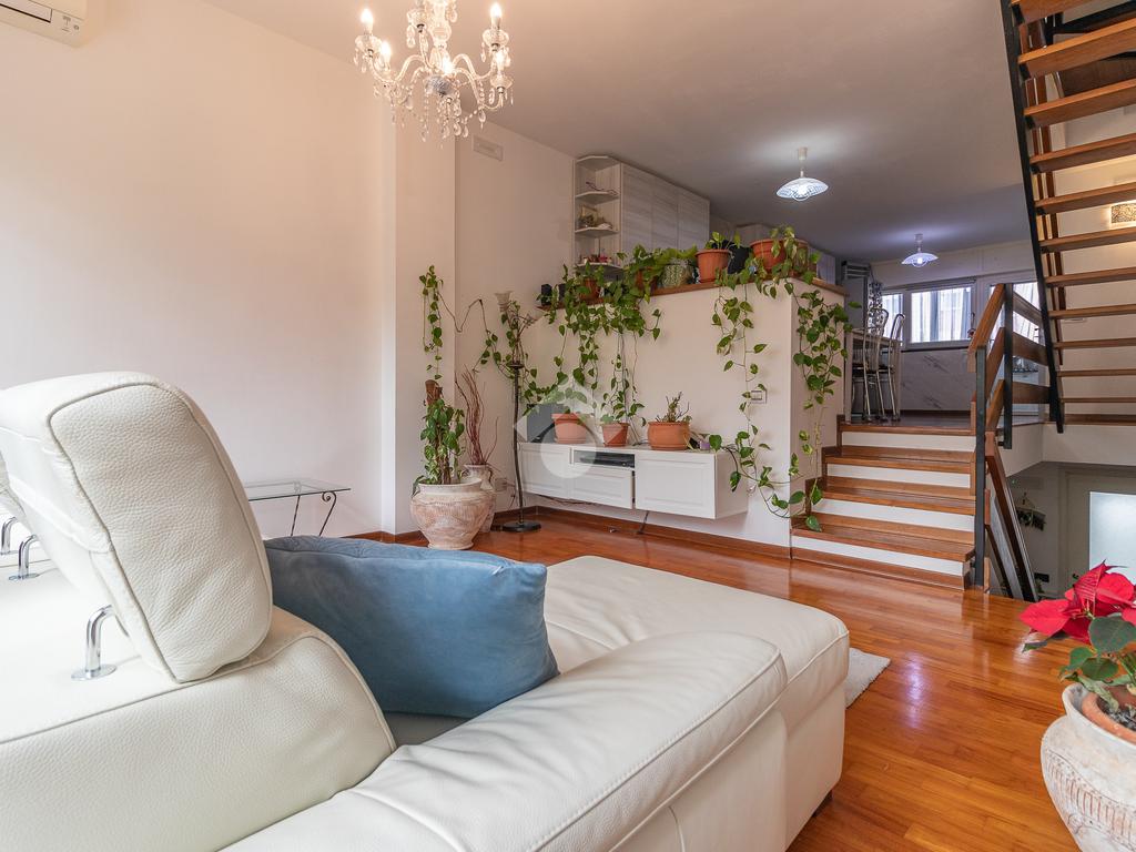 Alle spalle del divano si trova un ulteriore ingresso indipendente che porta direttamente al giardino sul retro. Pochi gradini separano il soggiorno dalla cucina abitabile, molto funzionale, con comodo ripostiglio e balcone verandato.