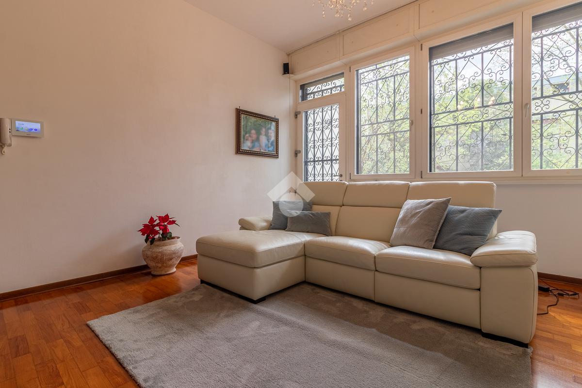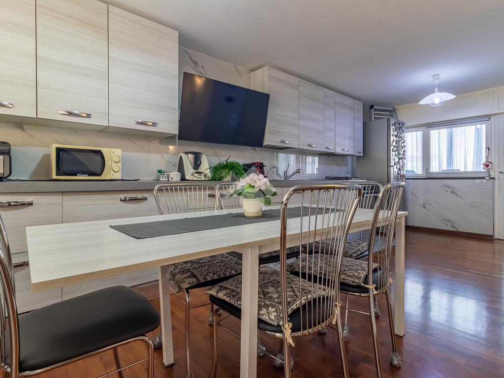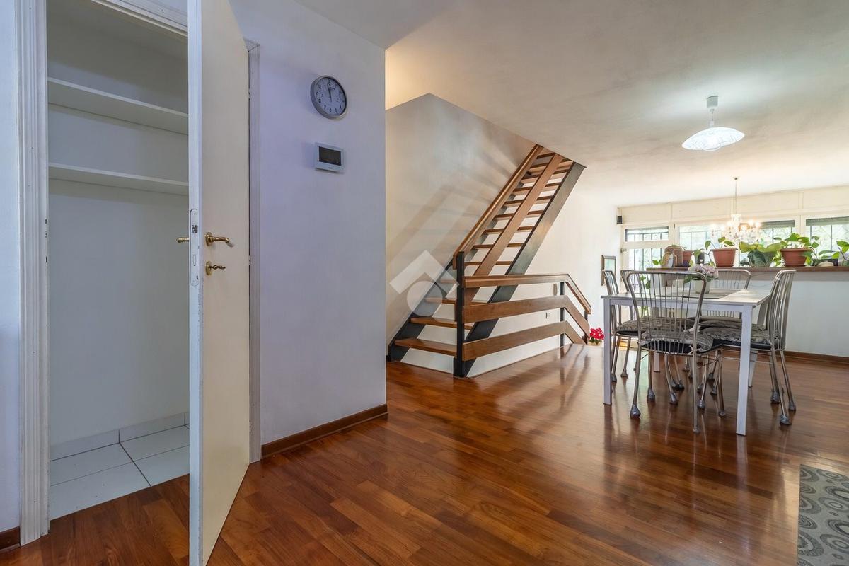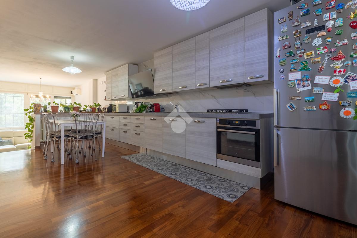 Alle spalle del divano si trova un ulteriore ingresso indipendente che porta direttamente al giardino sul retro. Pochi gradini separano il soggiorno dalla cucina abitabile, molto funzionale, con comodo ripostiglio e balcone verandato.