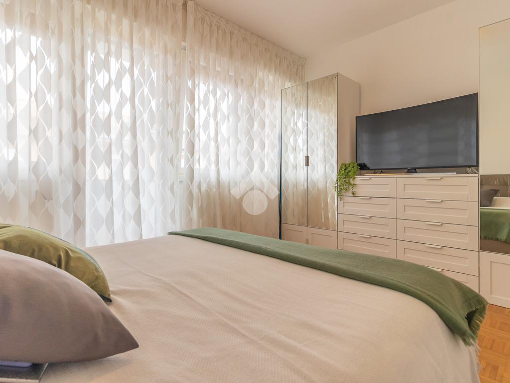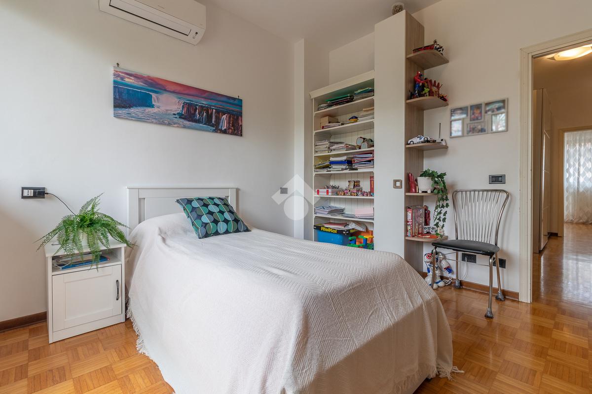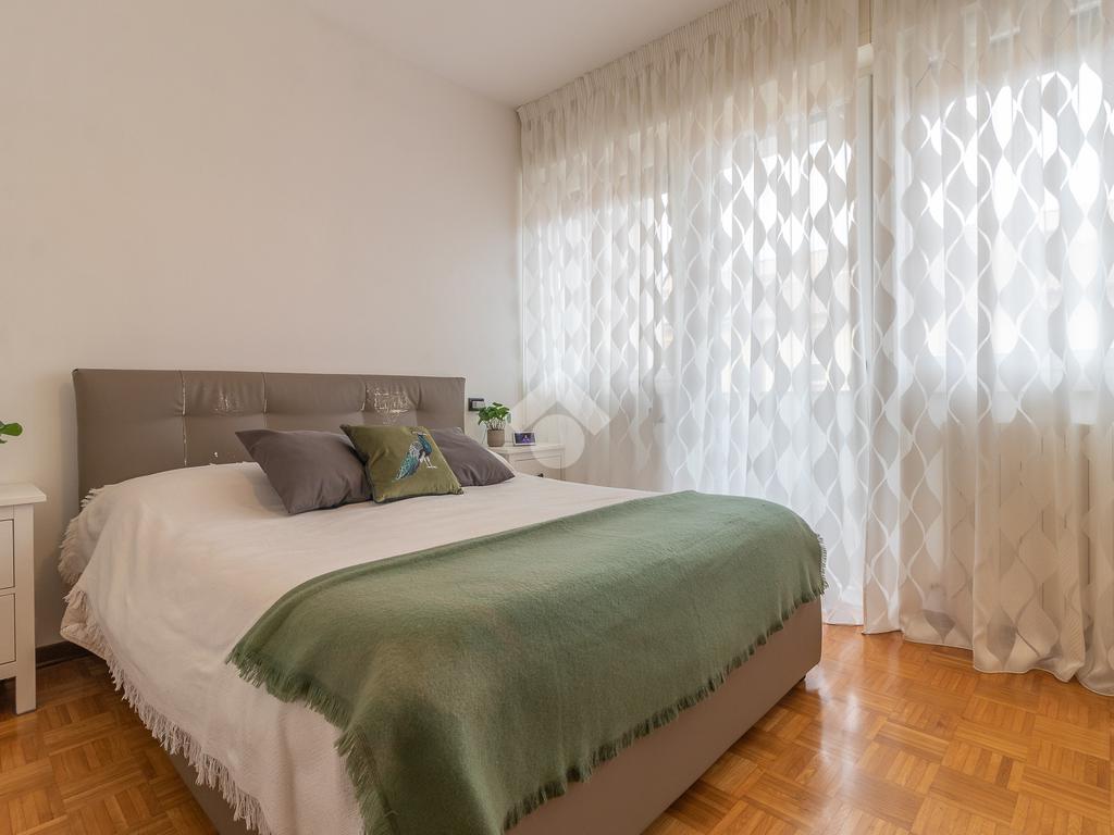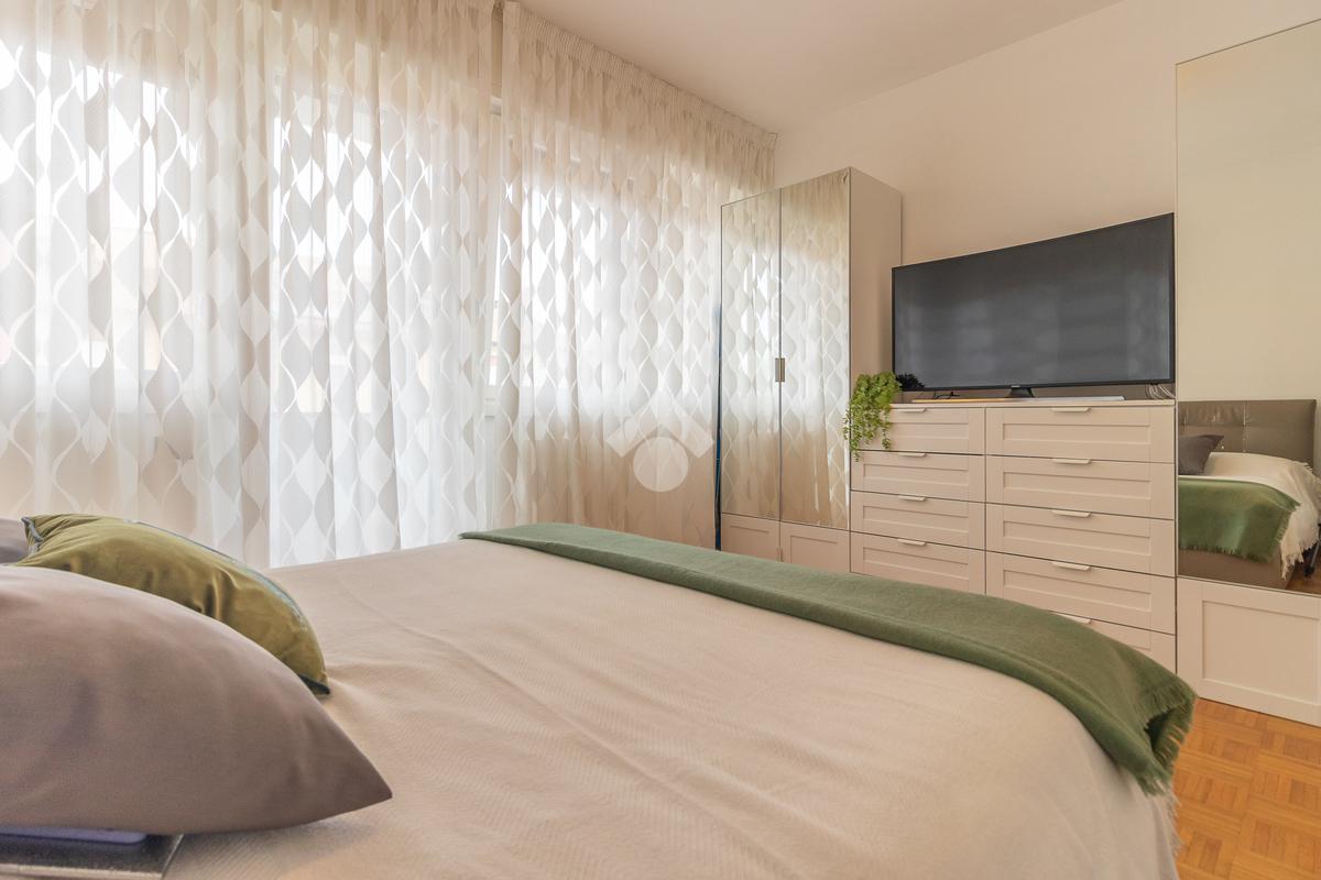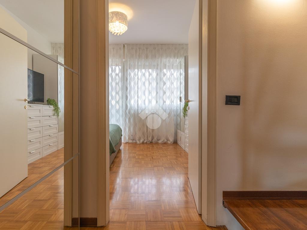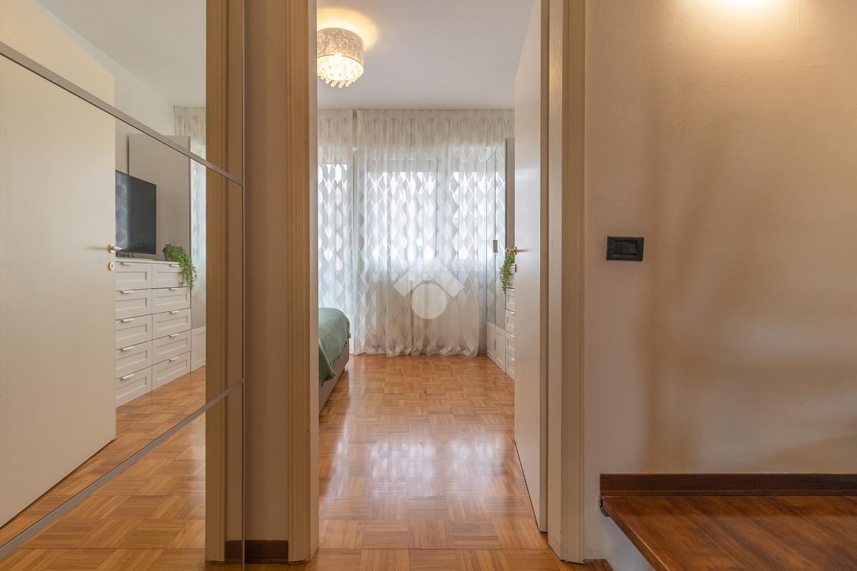 Proseguendo verso la zona notte, un corridoio distributivo ci porta alla camera padronale con accesso a un balcone privato, al secondo bagno cieco con box doccia e alla prima camera singola.
