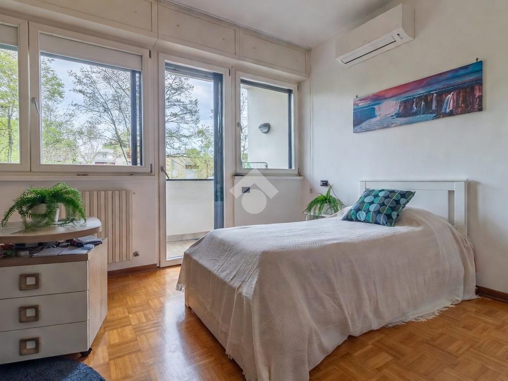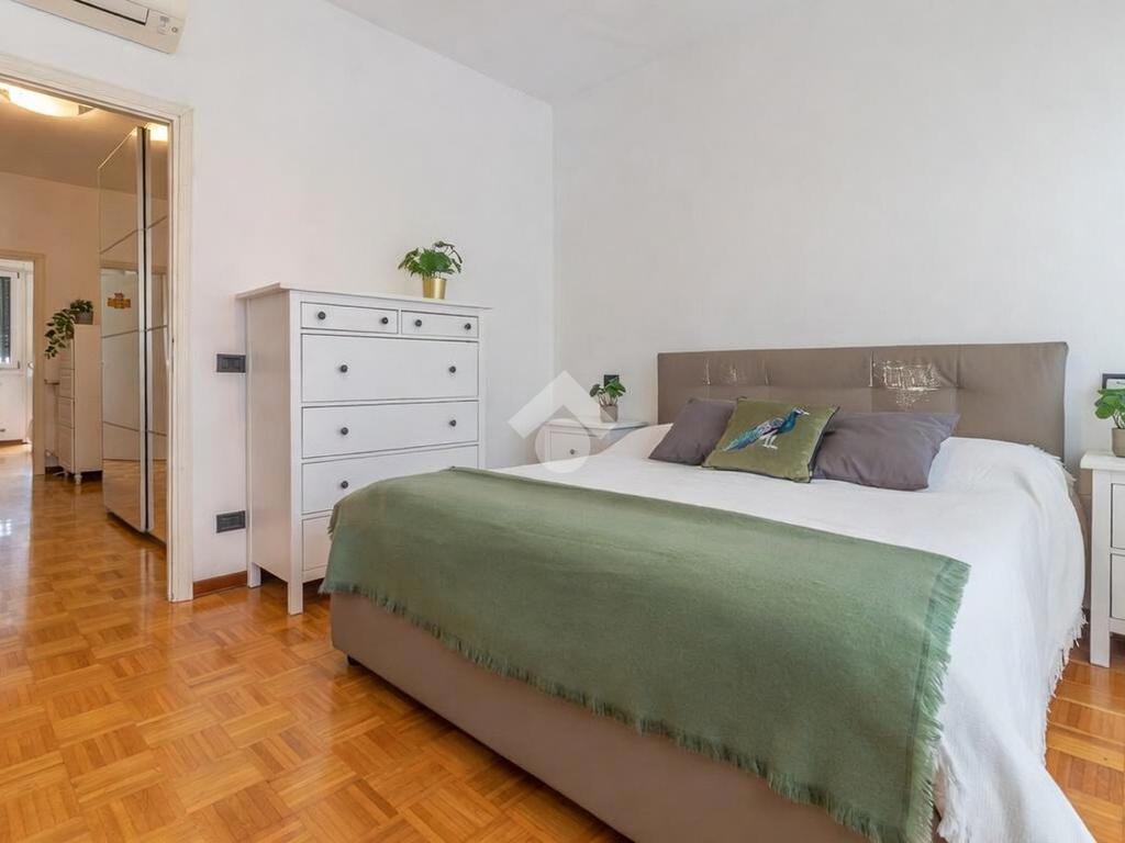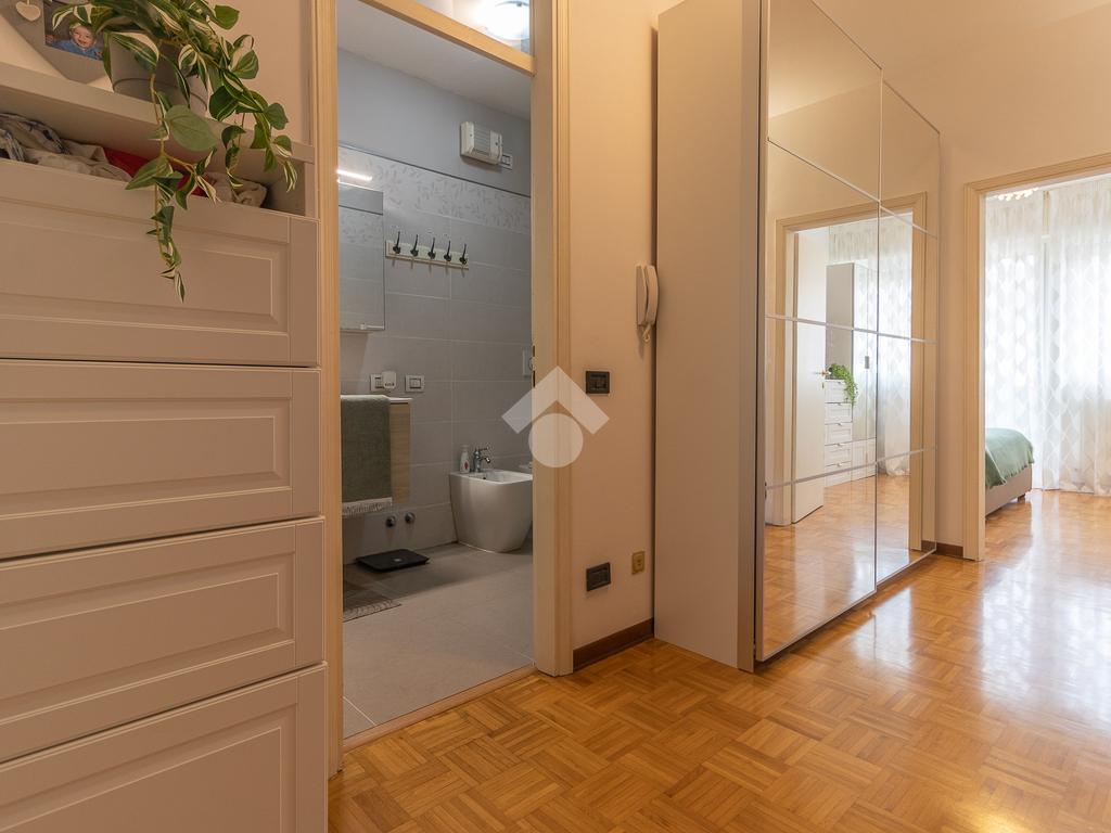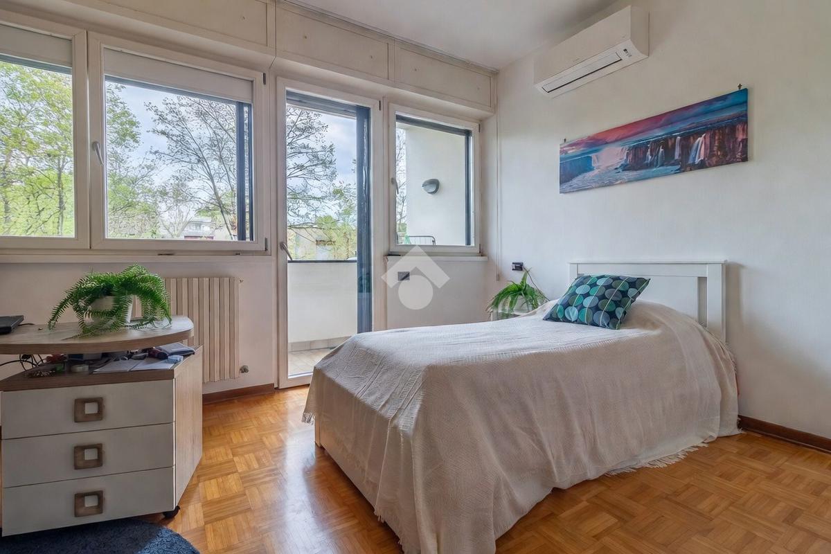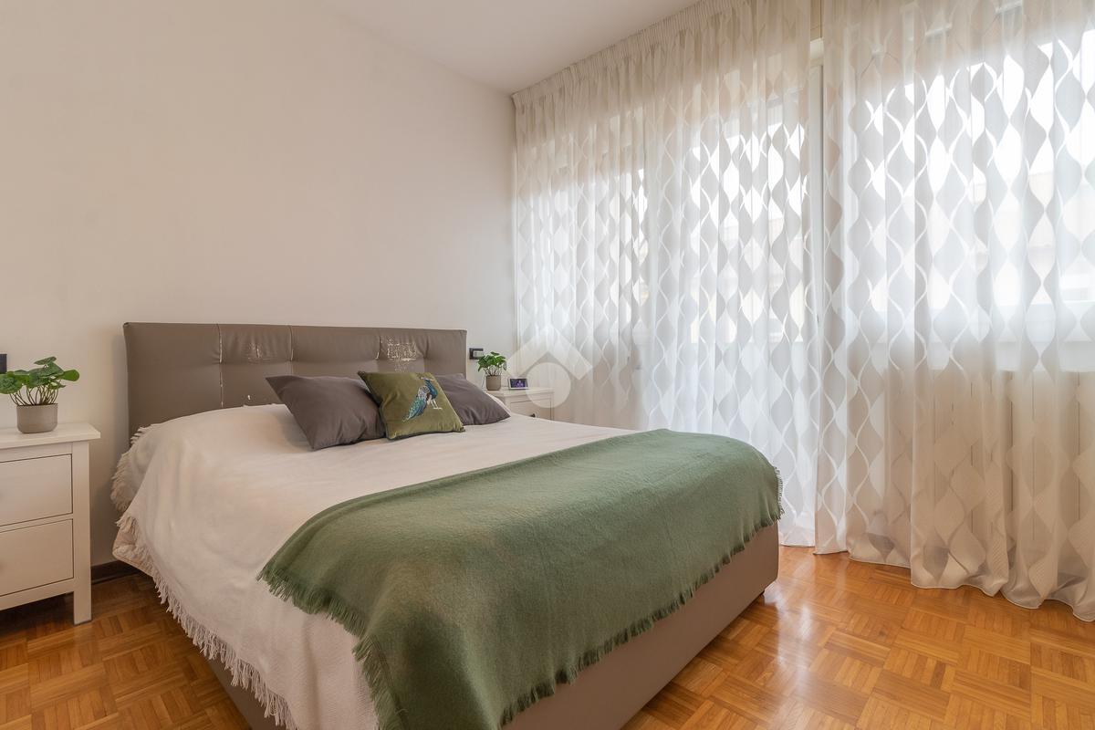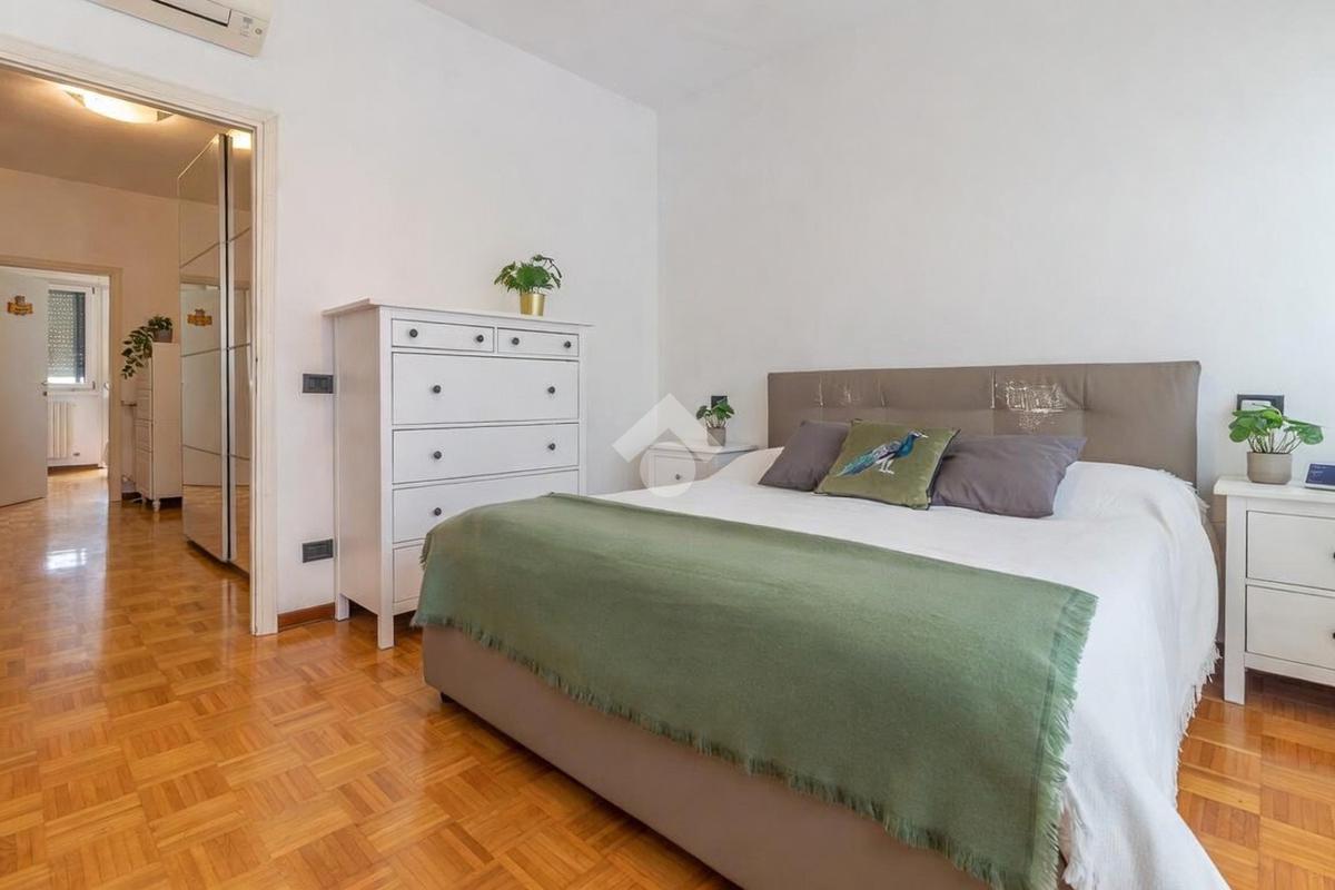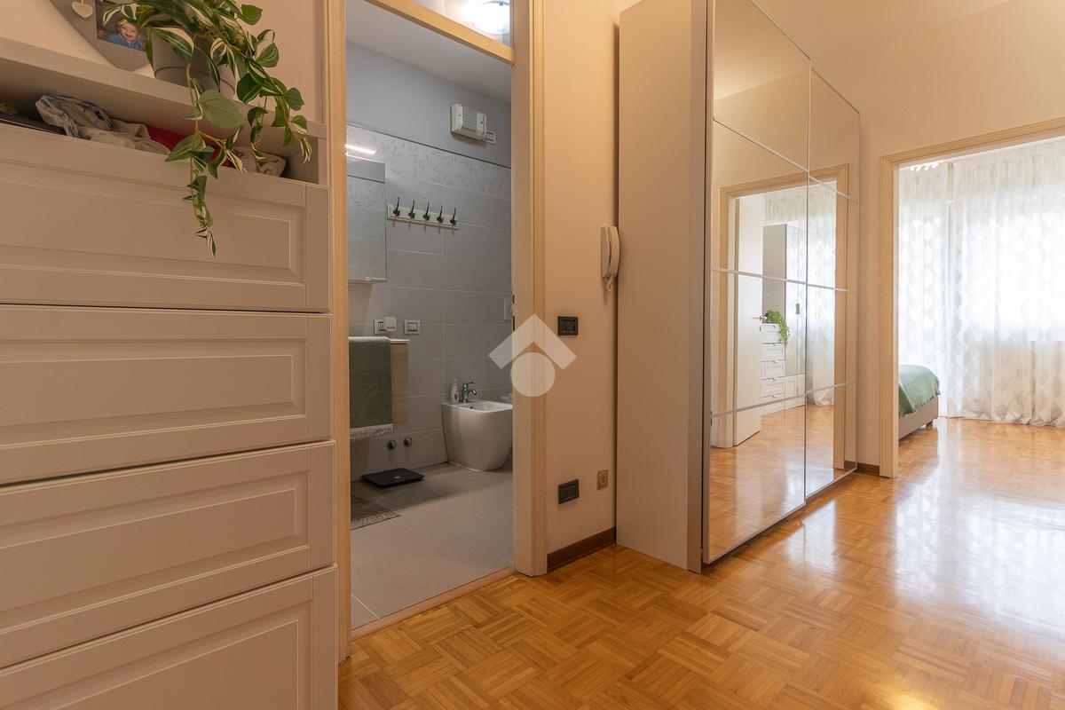 Proseguendo verso la zona notte, un corridoio distributivo ci porta alla camera padronale con accesso a un balcone privato, al secondo bagno cieco con box doccia e alla prima camera singola.