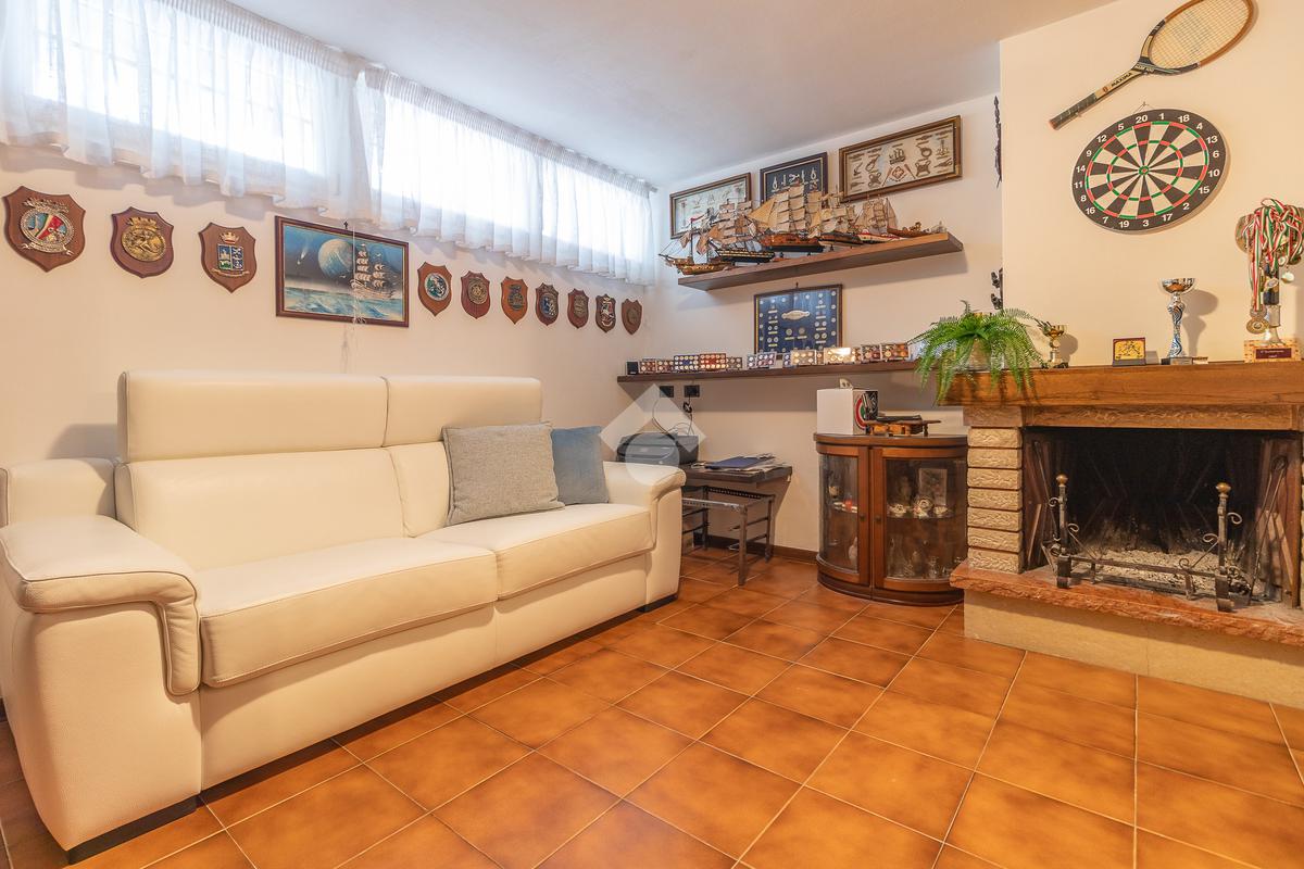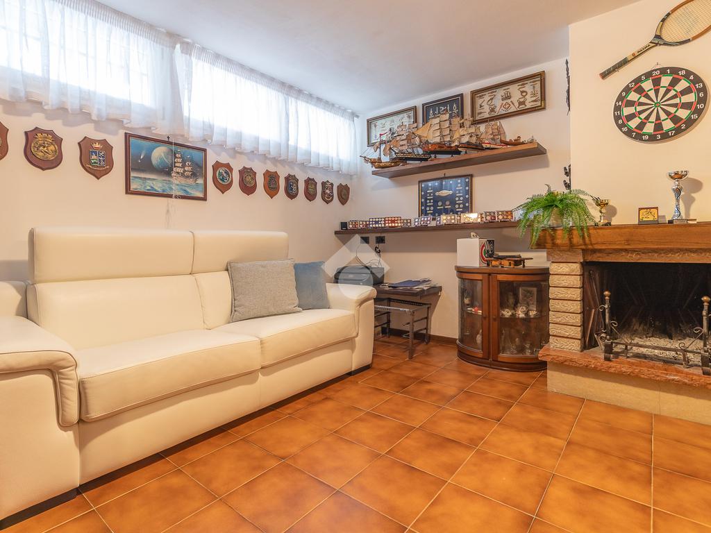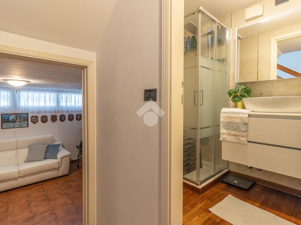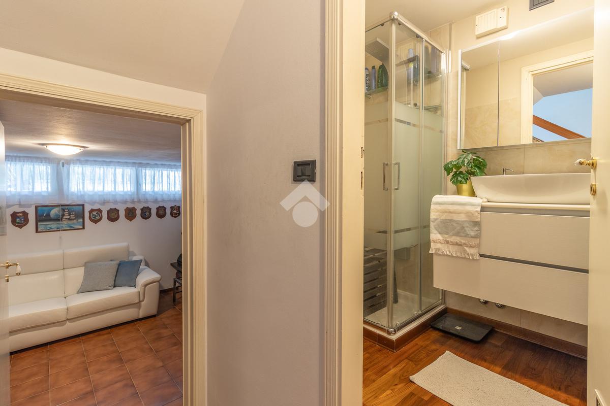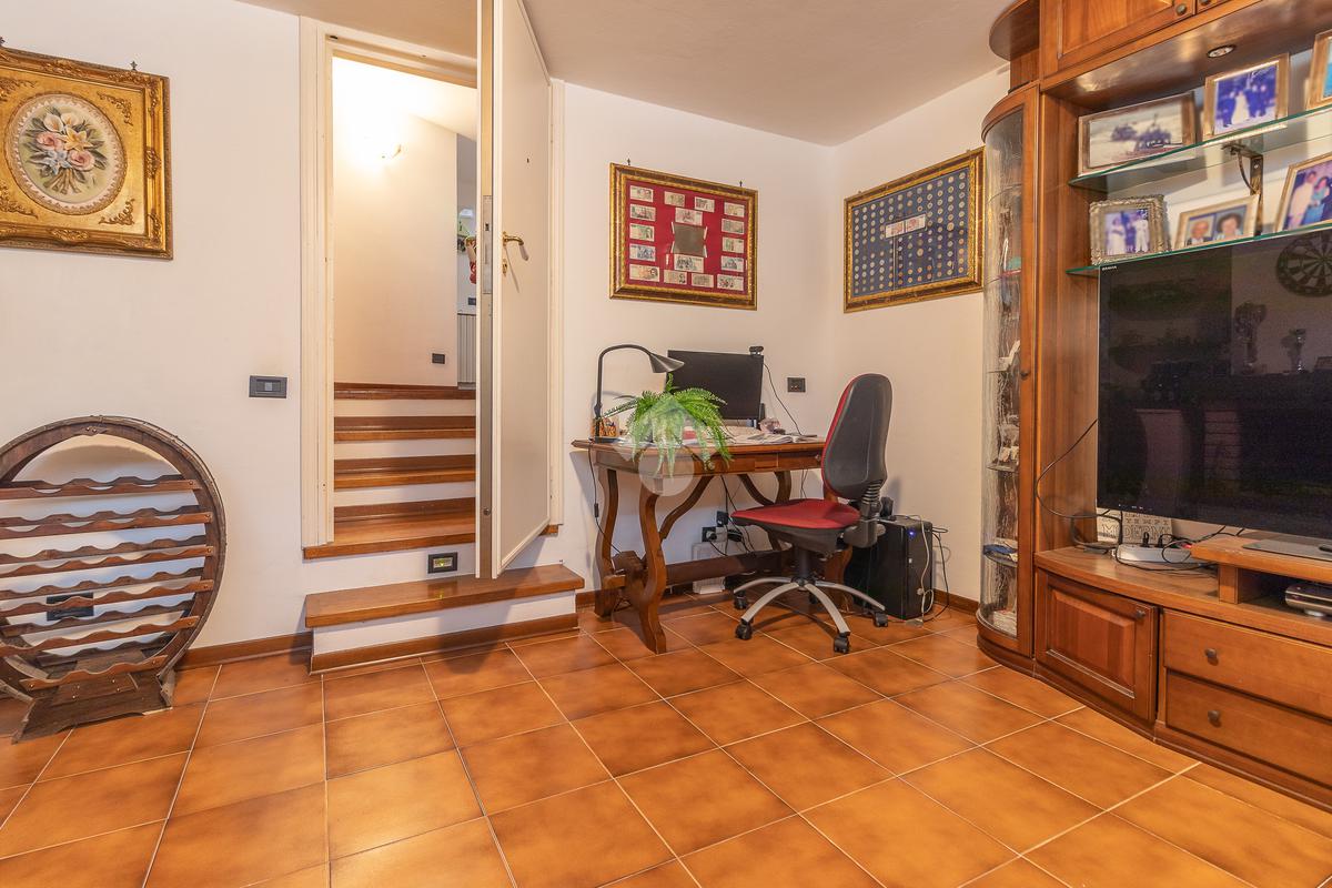 Un disimpegno ci introduce a un secondo ingresso, dove troviamo un pratico bagno di servizio cieco con doccia e, al piano inferiore, una tavernetta con camino attualmente adibita a salottino.