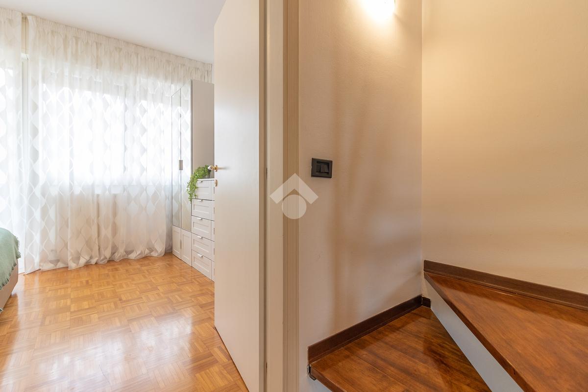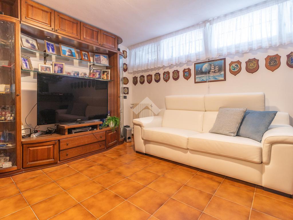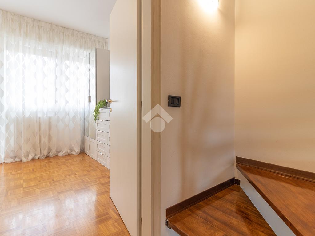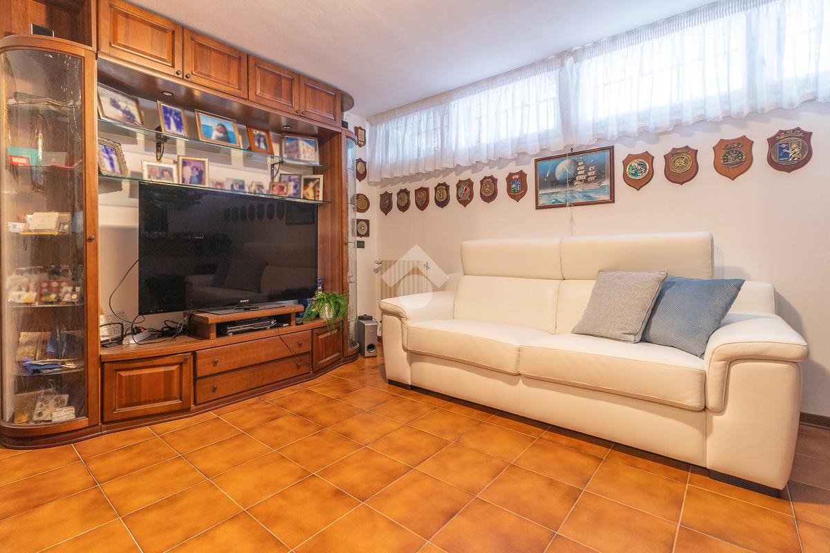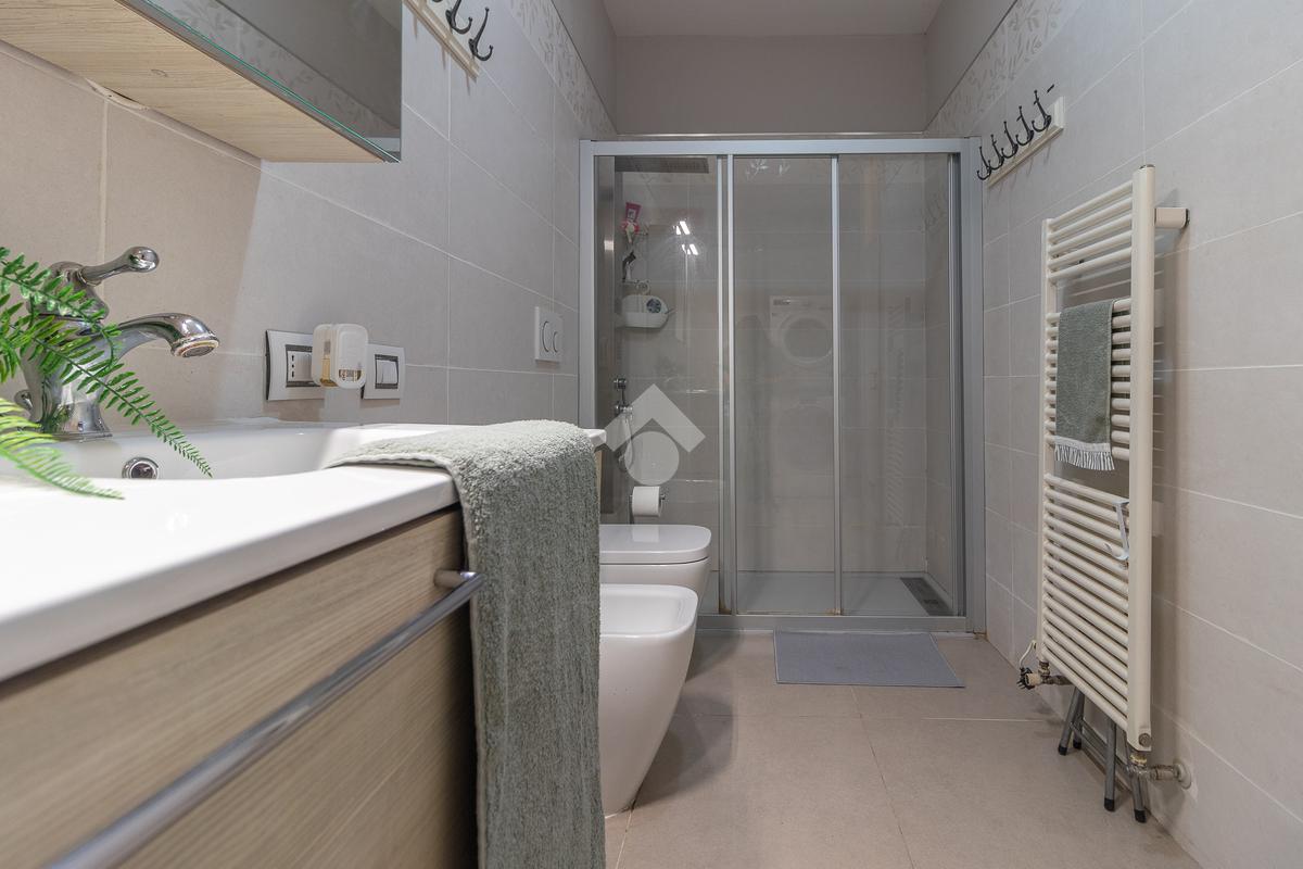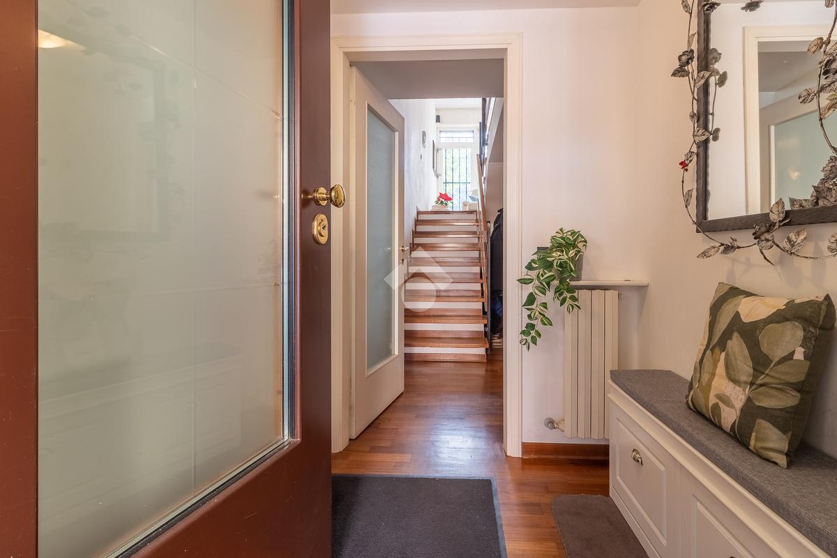 Un disimpegno ci introduce a un secondo ingresso, dove troviamo un pratico bagno di servizio cieco con doccia e, al piano inferiore, una tavernetta con camino attualmente adibita a salottino.